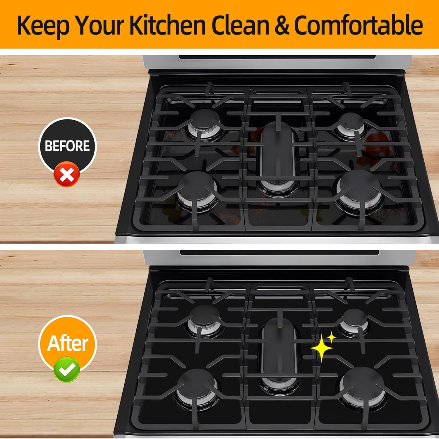 [Easy to Clean and Reusable]The black stove protectors for gas stove tops have a non-sticky surface, allowing for quick disposal of oil and other residues to maintain the cooker’s cleanliness and hygiene. The protective oven pad is easy to wash and can be directly scrubbed with water. Also placed in the dishwasher for cleaning, significantly saving time on stove cleaning. When this protector is in use, it erases any grease, crumbs, or mess. Additionally, the stove burner covers are reusable.