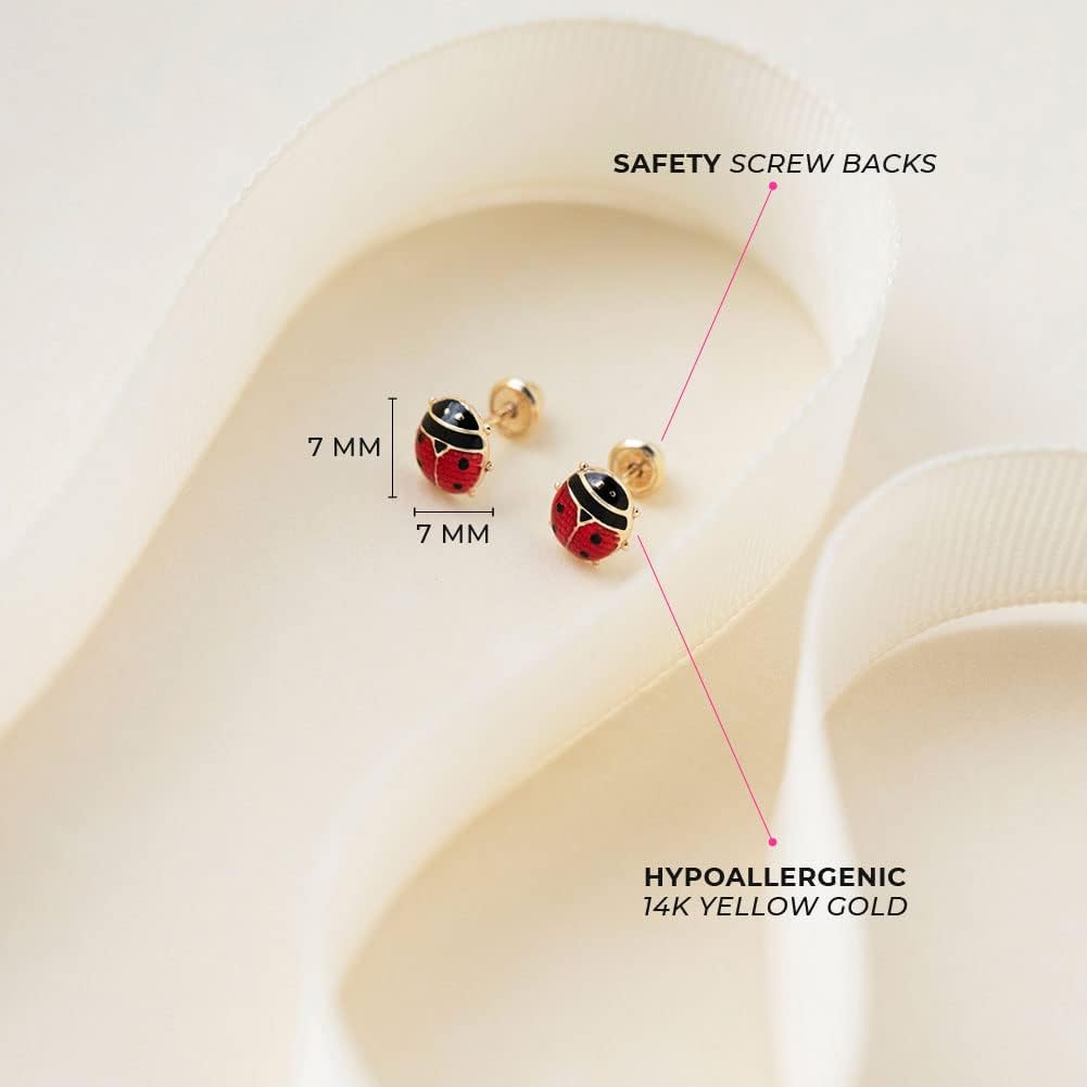 14k Yellow Gold Enamel Colorful Ladybug Screw Back Earrings for Toddlers & Young Girls – Ladybug Stud Earrings for Children with Safety Screw Back Locking – Kids Ladybug Earrings