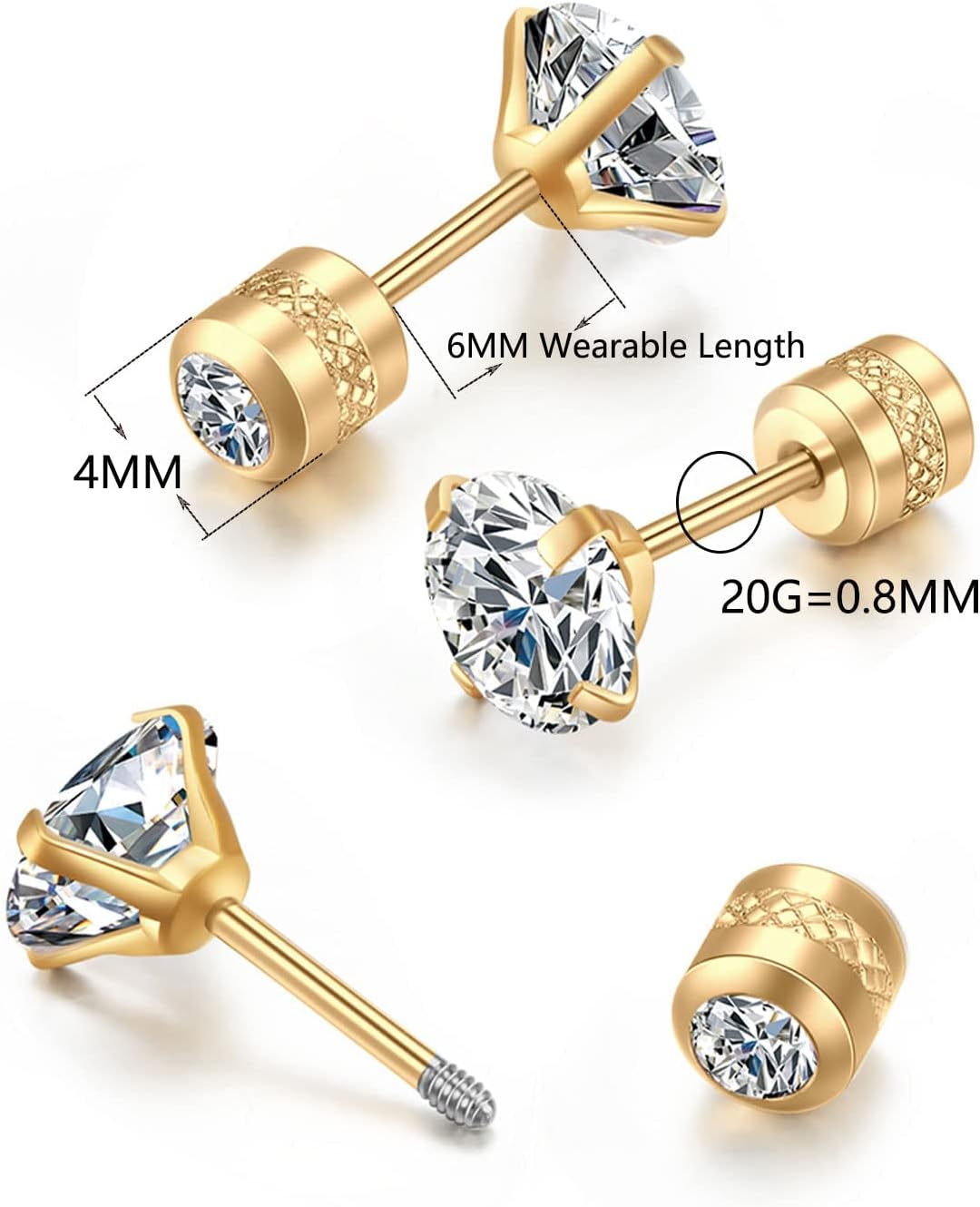 Titanium Flat Screw Back Stud Earrings for Girls,Safety Screw on CZ Earrings Hypoallergenic Surgical Steel Cartilage Earrings