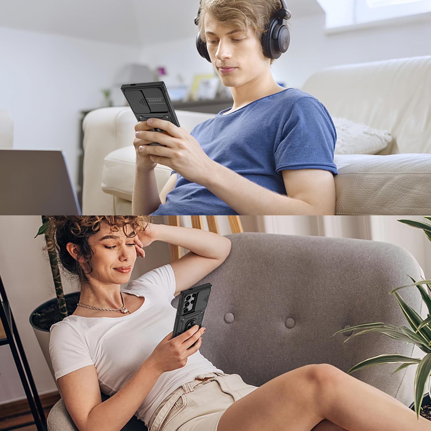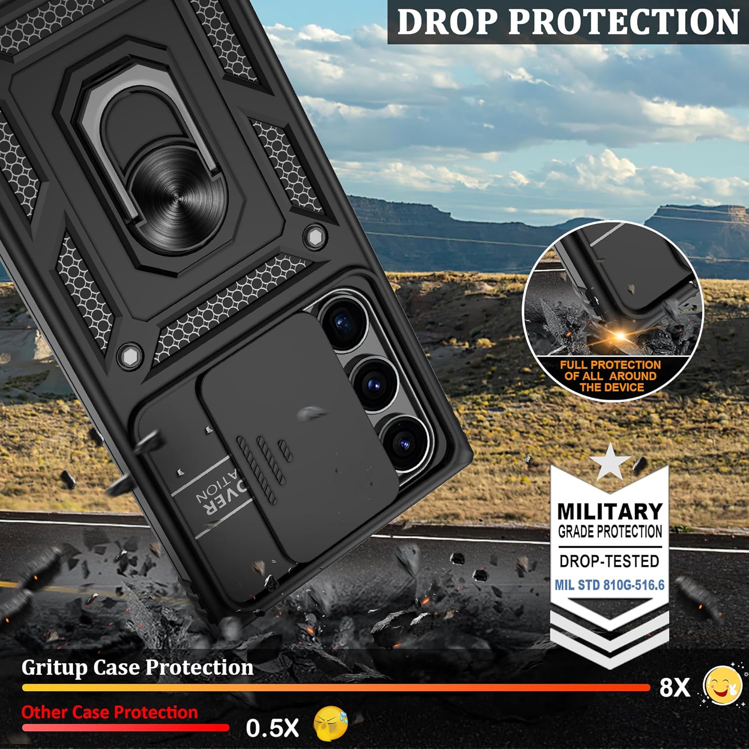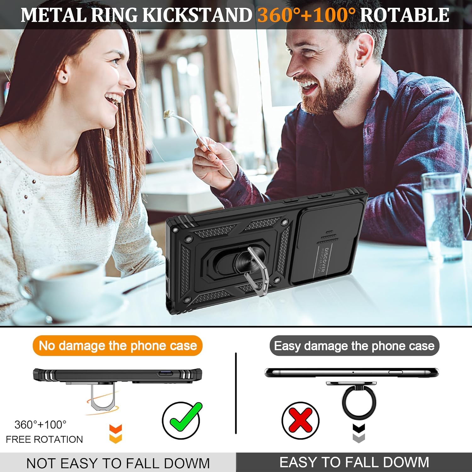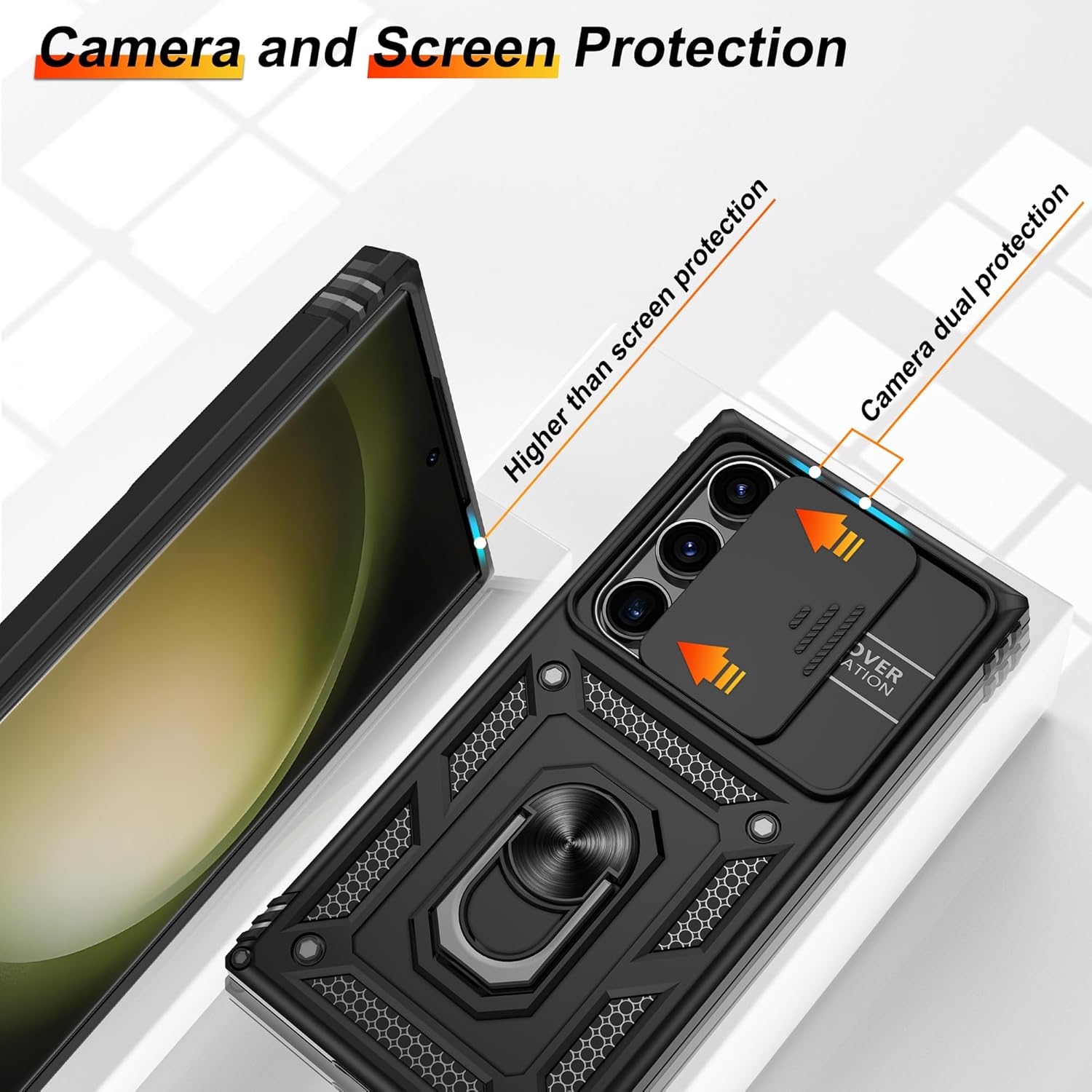 Fit for Samsung Galaxy S24 Ultra case with Slide Camera Cover & Screen Protector (2 Pack), Build in 360°Rotating Ring Kickstand [Military Grade] Protective Case for S24 Ultra Case,Black