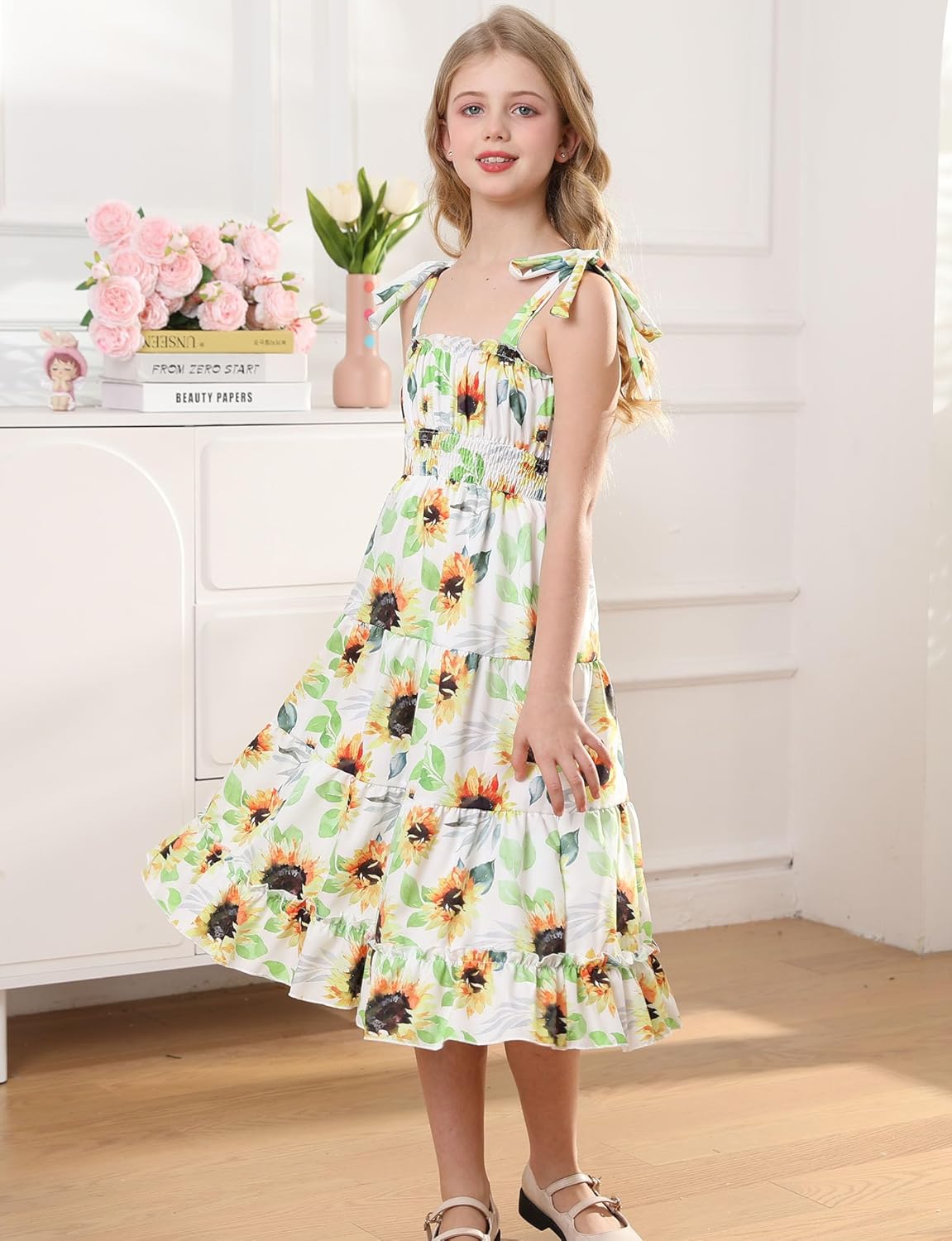 Girls Summer Dress for Kids Size 6-12 Smocked Tie Strap Tiered Square Neck Dresses