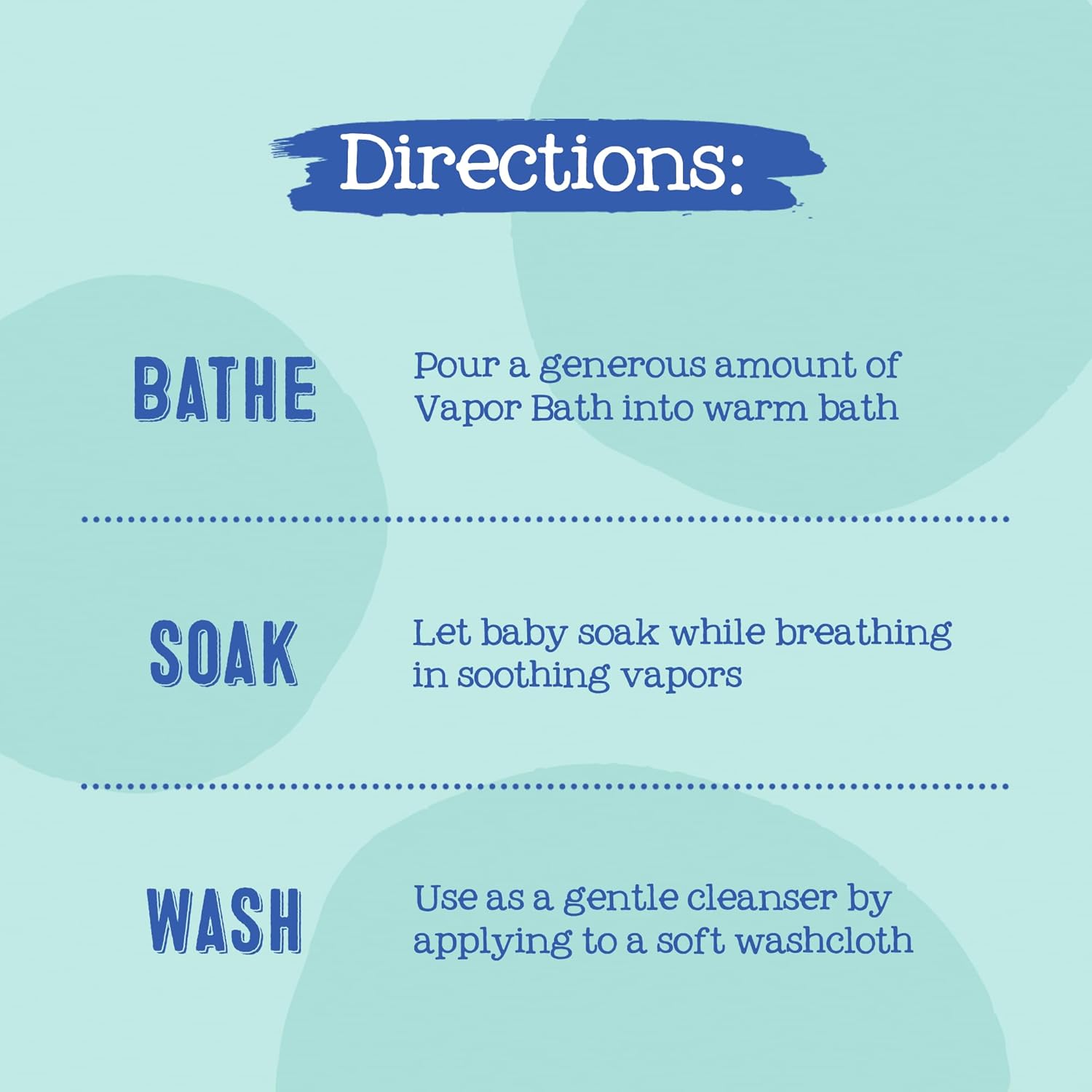 Directions: Pour a generous amount of Vapor Bath into a warm bath and allow your child to soak while breathing in the soothing vapors. Use foaming liquid as a gentle cleanser by applying to a soft washcloth.