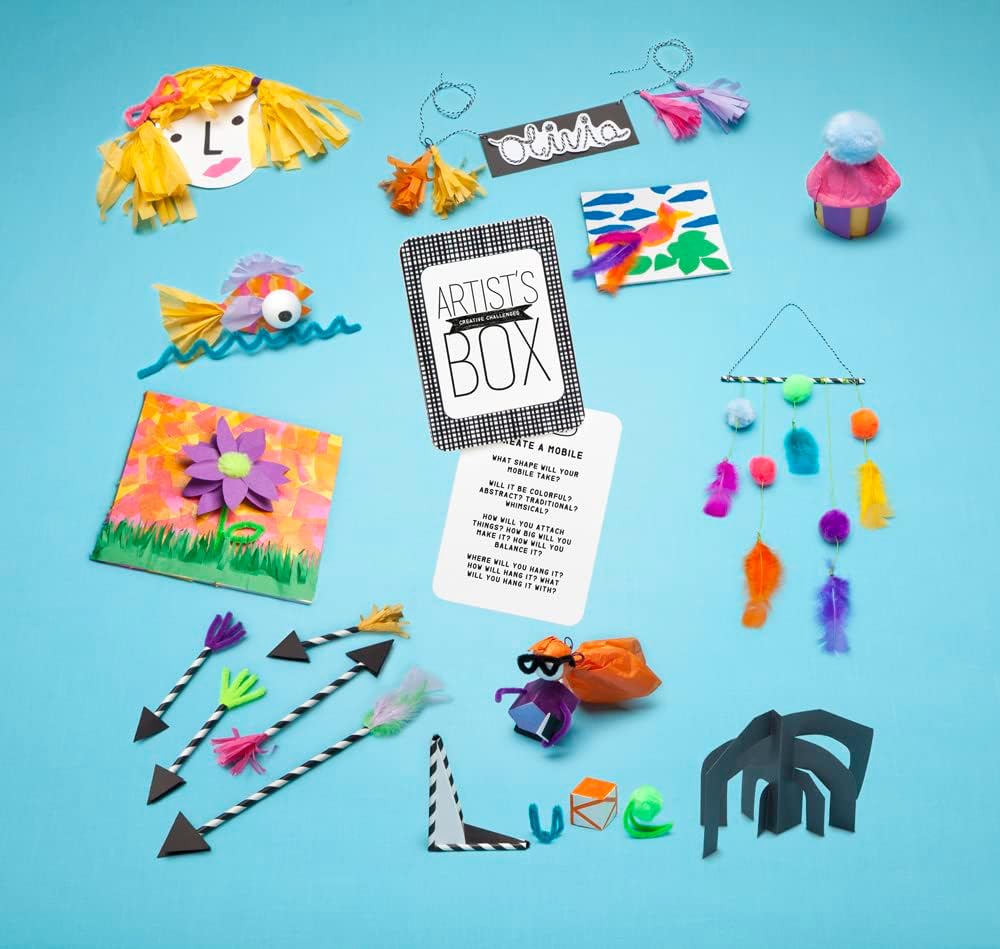 COMPLETE SET: The Craft-tastic Artist’s Box includes 7 pieces of tissue paper, 2 yards (1.8 m) of cotton embroidery thread, 4.3 yards (3.9 m) of cotton twine, 6 pom poms, 2 styrofoam balls, 7 chenille stems, 4 paper straws, 7 feathers, 4 pieces of paper, 1 piece of cardboard, 2 pieces of double-sided tape, 1 oz (29 ml) of water-based glue and 7 challenge cards.