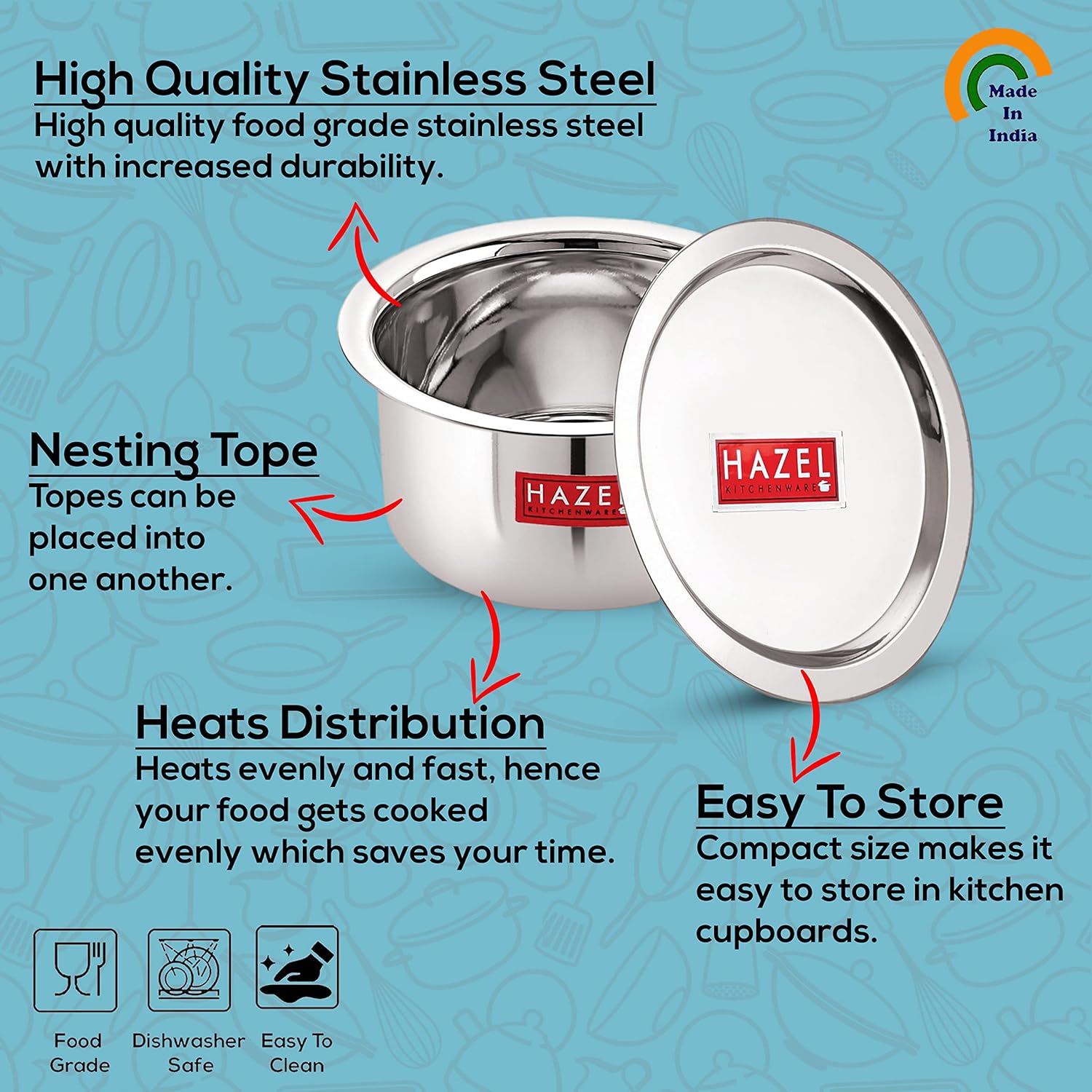 HAZEL presents a kitchen tope set with a lid that gives you a perfect dining experience. These utensils set for kitchen are convenient to use for multipurpose, can be used for boiling milk, making tea, storing and serving food. This stainless-steel tope set is very strong and durable, It can be used roughly and is not affected by minor scratches. These steel bhagona can be used both on gas stoves as well as an induction cooktops.