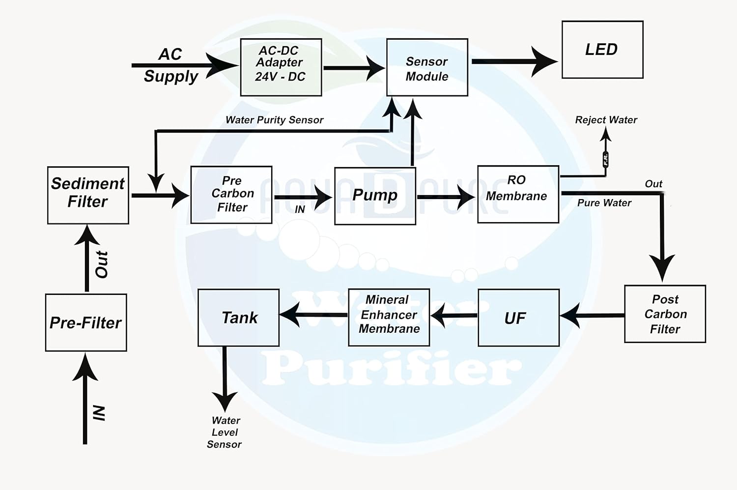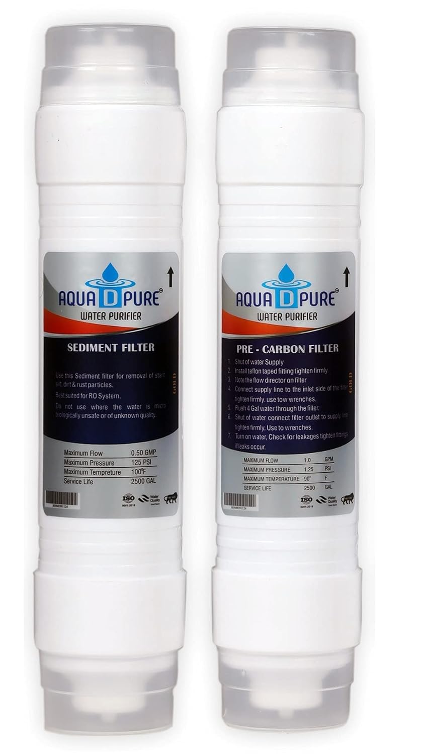 Inline Filters Sediment Filter: Sediment Filter removes fine and coarse particulate impurities from water. Pre Activated Carbon Filter Adsorbed: It absorbs chlorine and organic impurities such as harmful pesticides from water. It also adsorbs bad taste, colour and odour causing organic compounds from water. Aquadpure 80 GPD Membrane: High Quality 80 GPD Genuine ✔RO membrane, Its reduce up to 90 % of TDS of water. Mineral cartridges: are also known as alkaline filter and is installed after ro membrane filter, to give soothing and sweet taste to the pure drinking water. Membrane Housing: Constructed of High Quality Polypropylene Standard Size Reverse Osmosis Membrane Housing. Inline UF Filter: The Uf membrane 4 inches membranes are used for removal of microorganism and turbidity. TDS Meter: Easy to use for check your water TDS to improve water Quality.