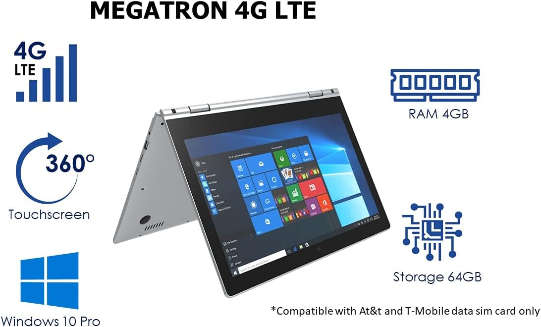 The stunning Megatron 4G Convertible Laptop offers 360 degrees of versatility for one affordable laptop. With a unique and durable 360° hinge that transitions effortlessly into four modes, there’s no limit to what this PC can do. Place it in either stand mode to watch shows, tent mode to play your favorite video games, notebook mode to work, or tablet mode to connect on the go. With access to advanced features on Windows 10 Pro, Megatron is the ideal PC to keep you up-to-date on social networks, gaming, e-books, movies, and music as well as work documents and emails. Gain a productive edge over the competition with Intel’s latest technology, Intel Pentium Processor. The built-in Quad Core processor delivers a lighting fast performance that handles multi-tasking seamlessly. With a striking capacitive high resolution touch screen, the Megatron 4G provides superb clarity and vivid display for a one-of-a-kind entertainment viewing experience. It’s equipped with a spacious 64GB hard drive, but with the USB port, Micro HDMI and Micro card reader, you can maximize storage up to 128GB to save all your important media. This versatile PC comes with built-in wireless connection at 802.11b/g/n and includes features such as the Windows Store, Office Work, Internet Browser, Calendar, Calculator, Email, Picture Viewing, Music/Video Playback, Games and so much more!
