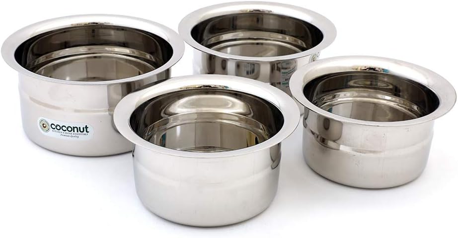 Coconut is a range of innovative and products for Home and Kitchen utilities.This Cookware Can Be Used On Your Gas Stove As Well As The Induction Top. Compatible For Both Induction And Gas Stove Use.Compaq Size Makes It Easy To Store In Kitchen Cupboards. When Not In Use, Stack The Smaller Container Inside Bigger Containers Saving Storage Space. Easy To Clean & Maintain. Product content: SS Rose Baby Topes without Lid Set of 4 – (Tope 1: 300ML – Width – 5 Inches & 2.75 Inches Height) , (Tope 2: 400ML – Width – 5.5 Inches & 2.75 Inches Height) , (Tope 3: 500ML – Width – 5.75 Inches & 3 Inches Height) , (Tope 4: 600ML – Width – 6 Inches & 3 Inches Height) .