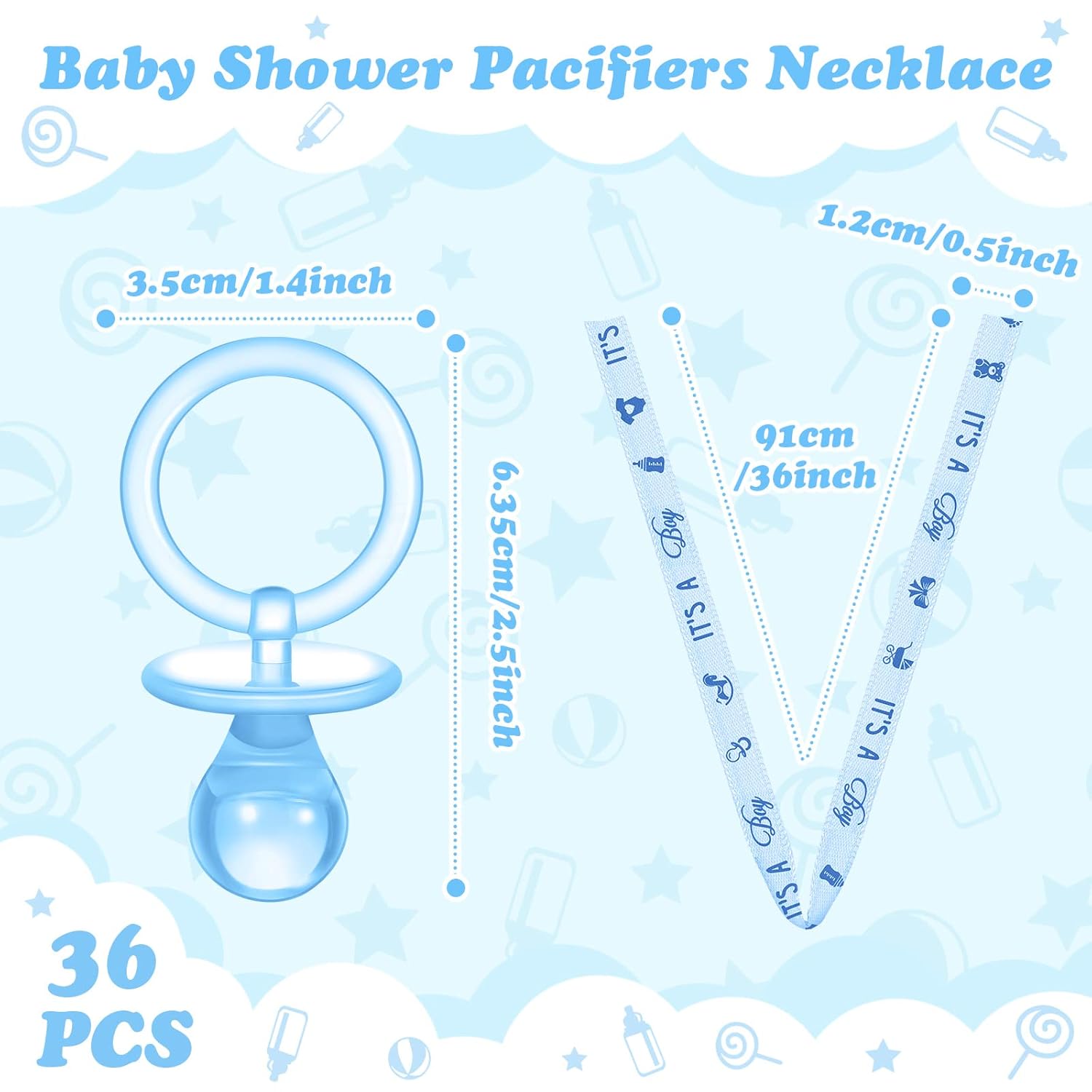 Rich in Quantity: receive 36 pieces pacifiers for baby shower, ribbons emblazoned with the words ” IT’s A Boy” and other baby related patterns, in sufficient quantities to be worn on daily life or shared with family or friends; Note: the pacifier necklace is only applied as a decoration; Please do not put the pacifier in your mouth for adults or children; High temperature to clean pacifiers before decorating the donuts