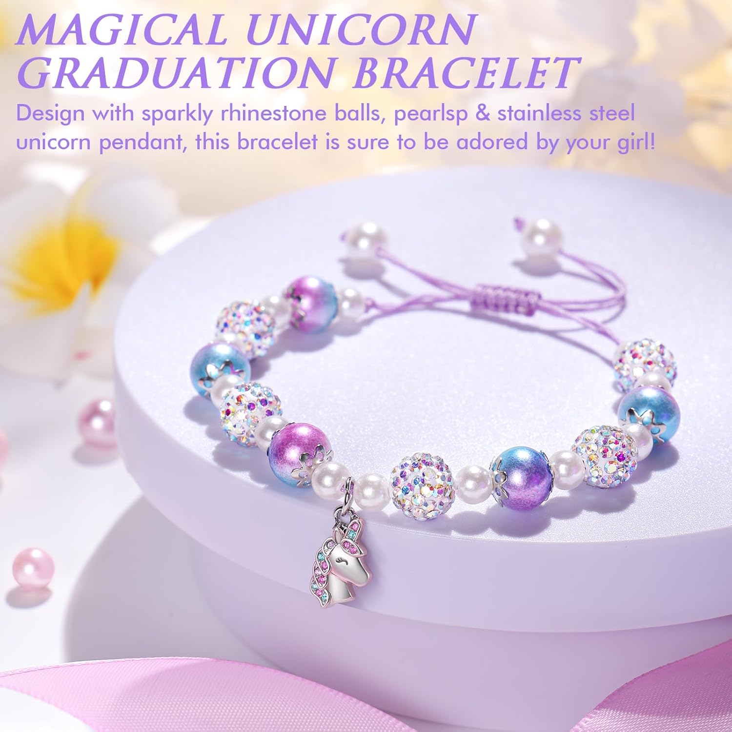 Your girl will be so surprised & happy when she receives this unicorn bracelet graduation gifts box with card.