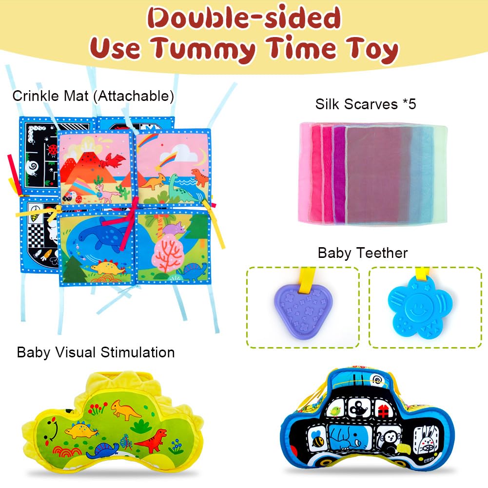 【4 In 1 Versatile Baby Toys】Our infant toy provides a tummy time pillow toy,4 multi-themed baby tummy time mat, 5 colorful silk scarves & 2 baby teething toys for 0+month toddlers to play with. Tummy time pillow is super soft that enables your baby to move around with fun. Baby sensory mat with crinkle paper inside attracts children with vibrant colors and crumpled sound.