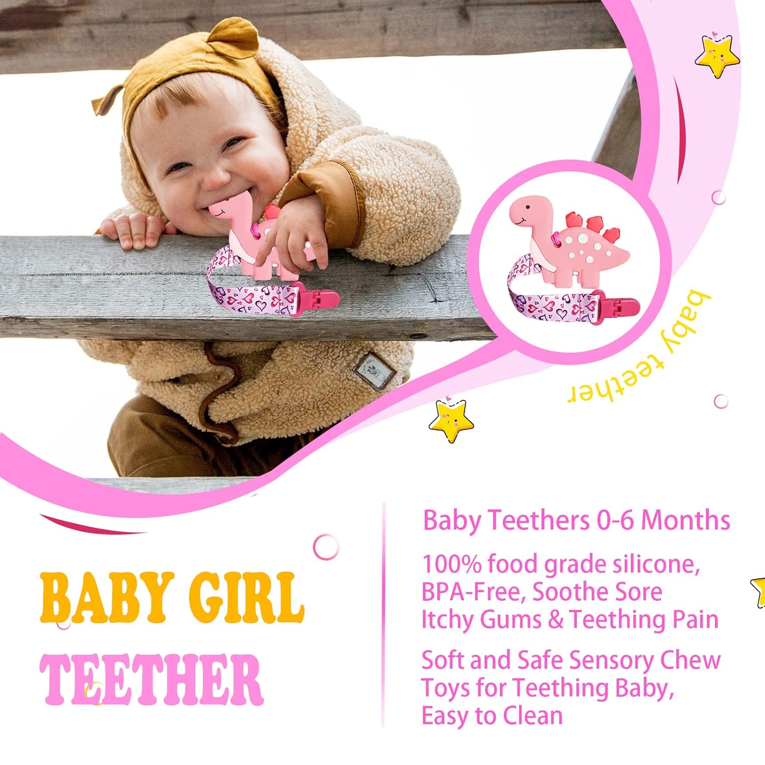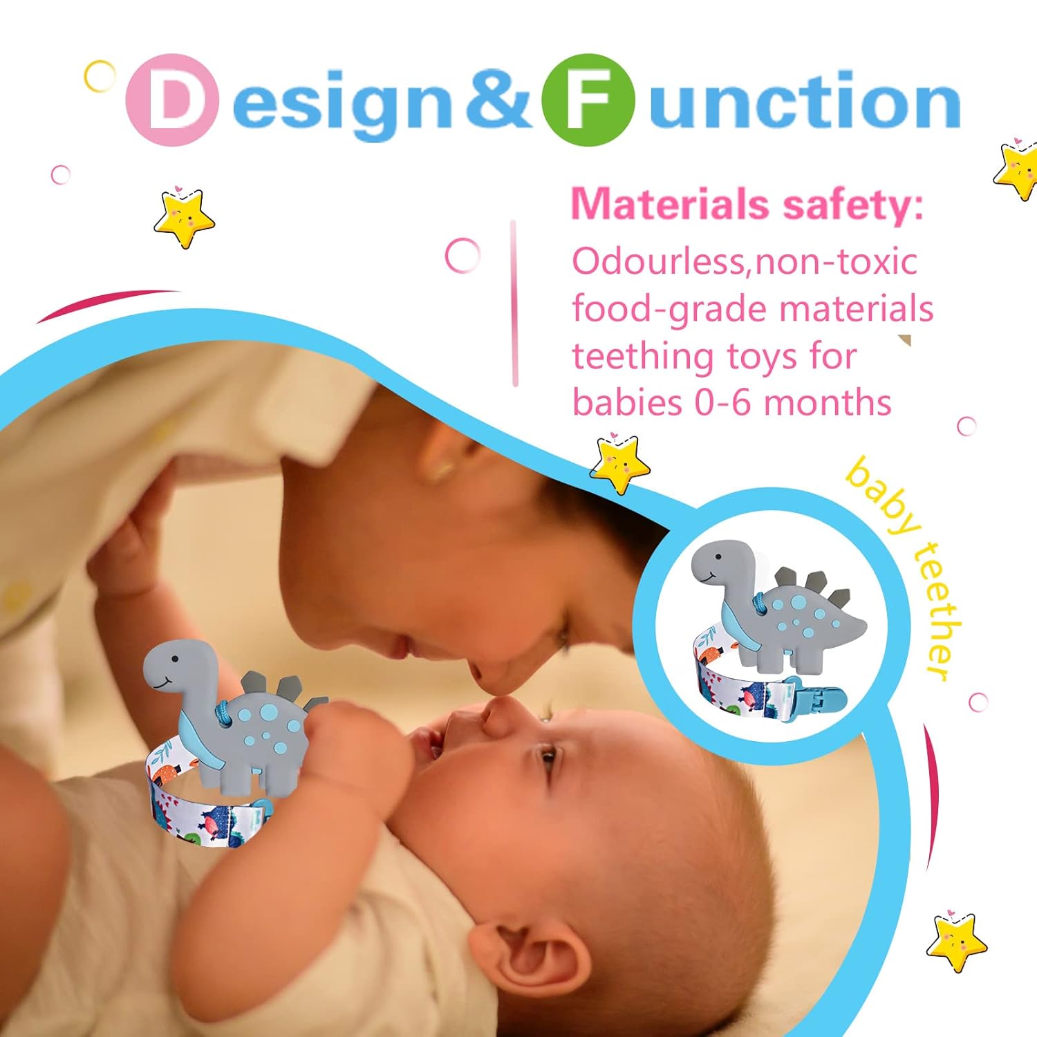 1 Soft Dinosaur Teether for Babies and 1 Baby Pacifier Clip, Valentines Day Gifts for Baby Girl Boy,Silicone Chew Toys for Baby (Grey Dinosaur)