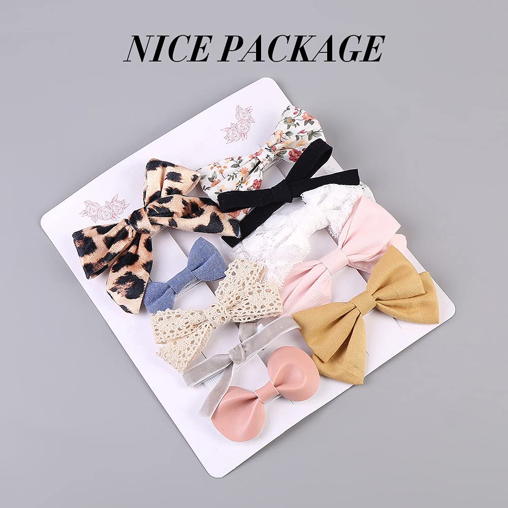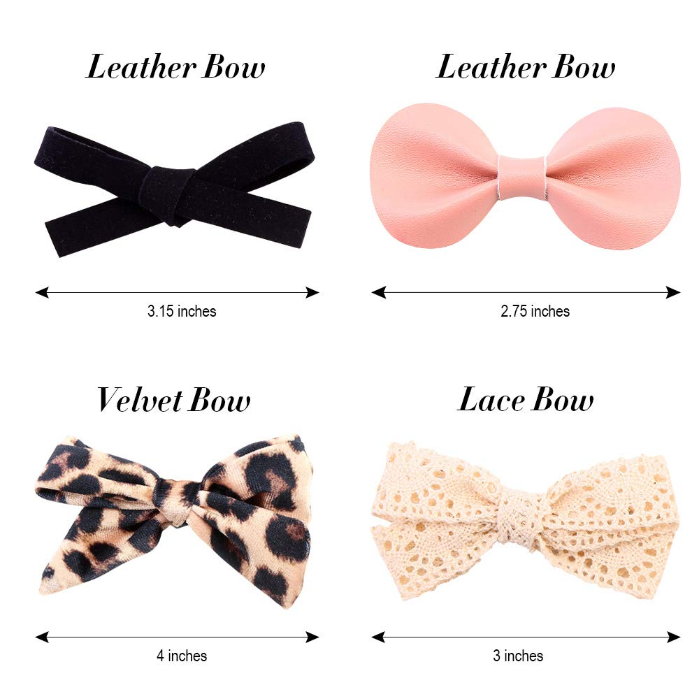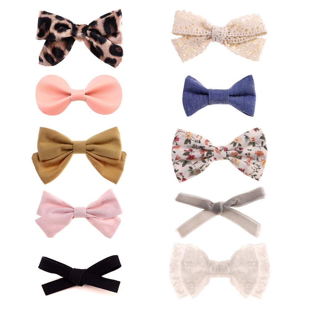 ❤10 PACK HAIR BOWS: We offer 10 different styles, colors and patterns clips to match any of your lovely girls’ outfit. The assortment of beautiful girl hair clips includes velvet leopard bows, yellow cotton bow, pink linen bows, white lace bow, faux leather bows, floral flower bow, solid colors and more!