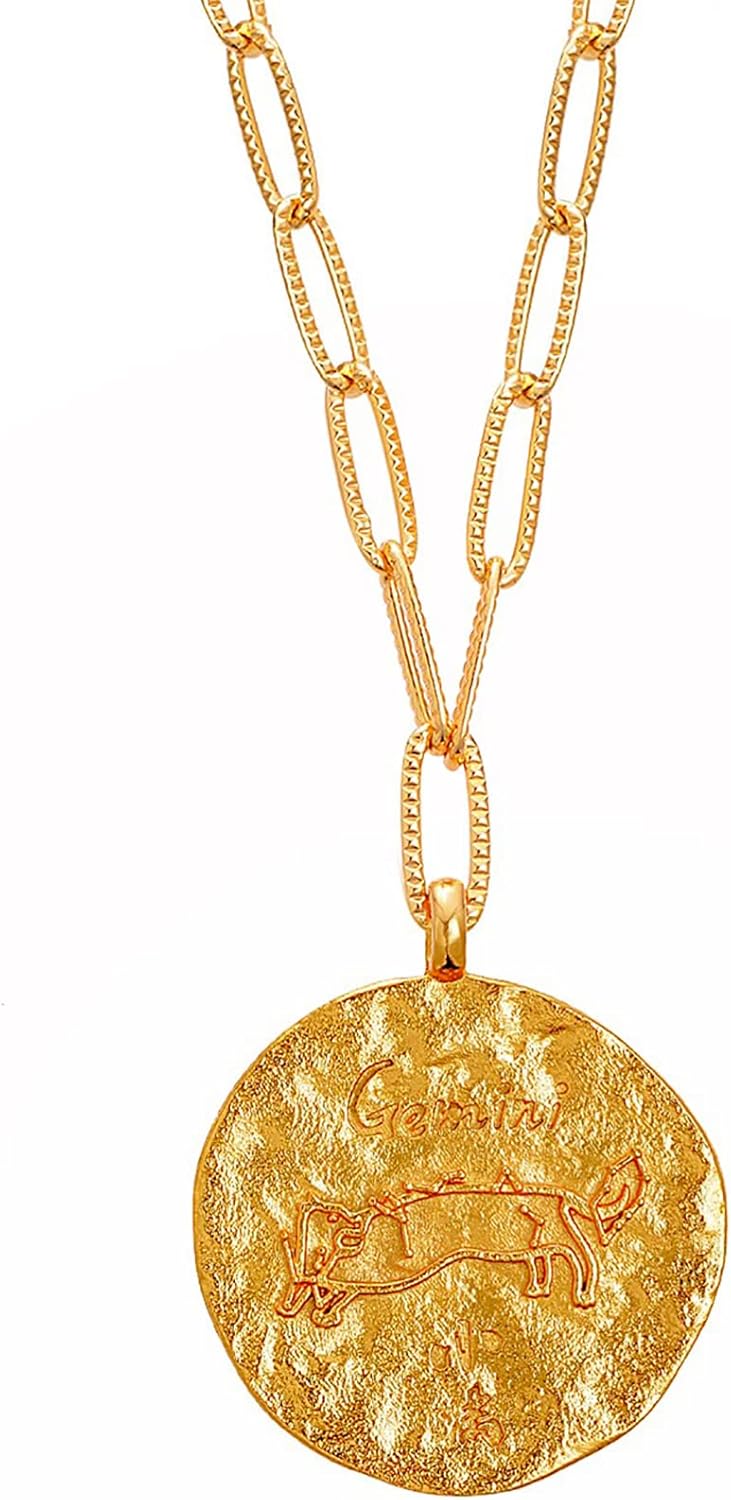 12 Constellation Necklace Lucky Zodiac Personalized Necklace 18K Heavy Gold Plated Paperclip Chain Necklace with Crystals and Gemstones Double Sided Coin Necklace Birthday Day Gifts for Women Girls
