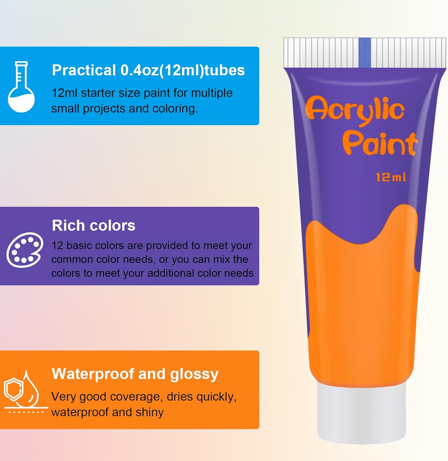 These advantages make 12 colors, high-quality, 0.4 OZ acrylic paint a popular choice for a wide range of artistic projects.