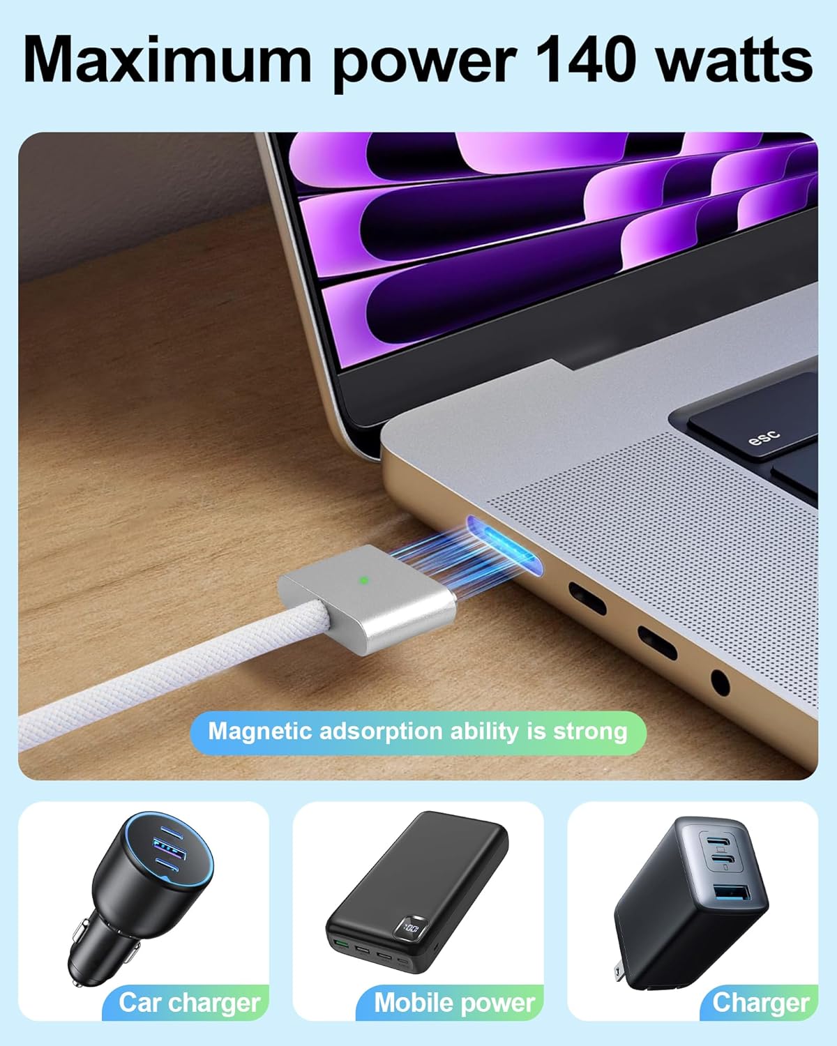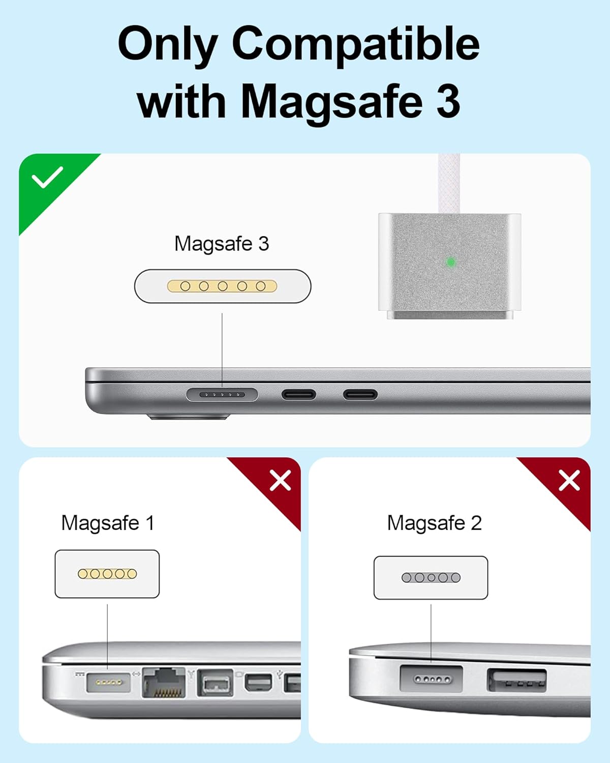 【Broad compatibility】This magnetic 3 cable compatible with MacBook Air 2023 (M2, 15-inch), MacBook Air 2022 (M2, 13-inch), MacBook Pro 2023 (M2, 14-inch), MacBook Pro 2023 (M2, 16-inch), MacBook Pro 2021 (M1, 14-inch), MacBook Pro 2021 (M1, 16-inch).
