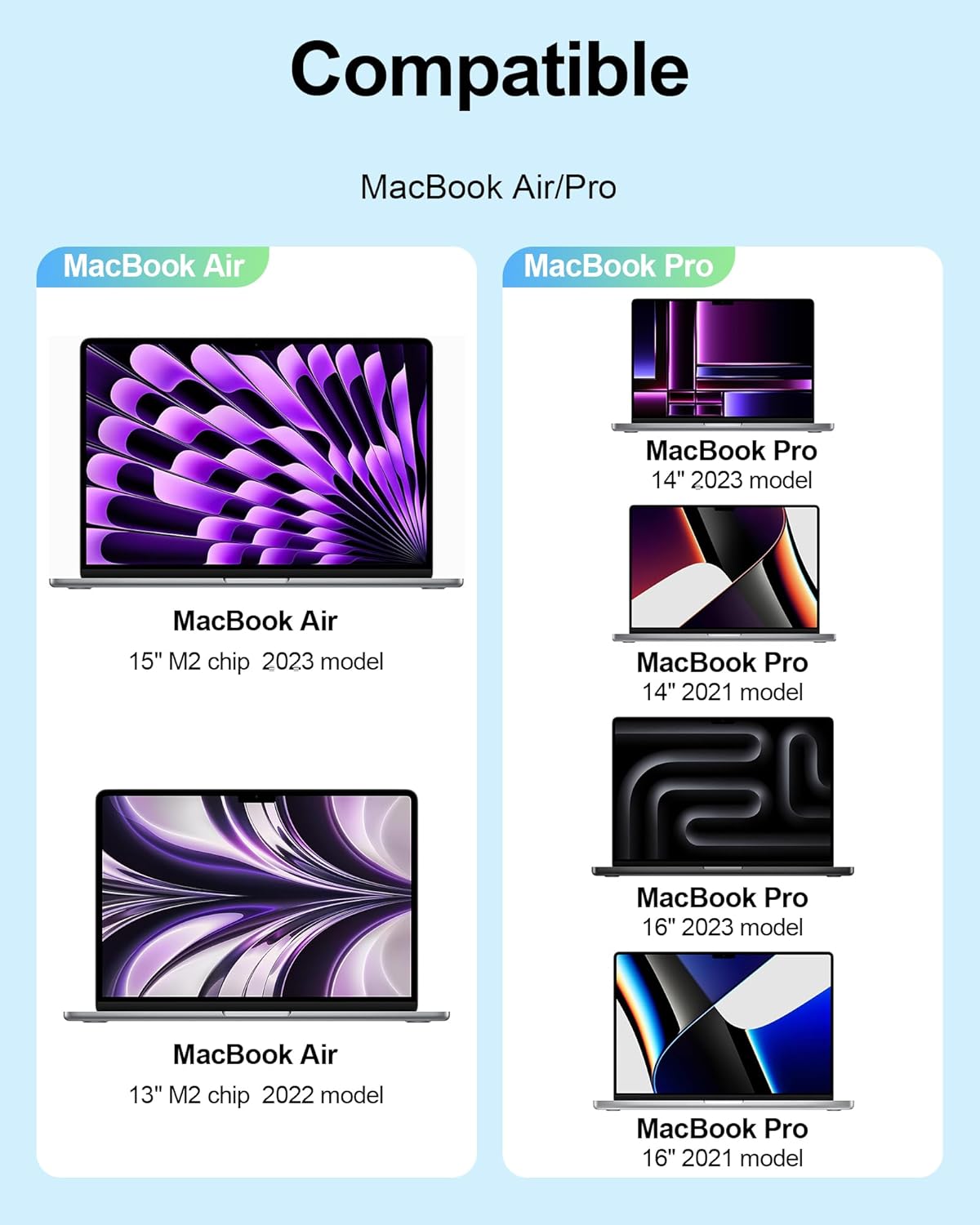 compatible with MacBook Air 2023 (M2, 15-inch), MacBook Air 2022 (M2, 13-inch), MacBook Pro 2023 (M2, 14-inch), MacBook Pro 2023 (M2, 16-inch), MacBook Pro 2021 (M1, 14-inch), MacBook Pro 2021 (M1, 16-inch).