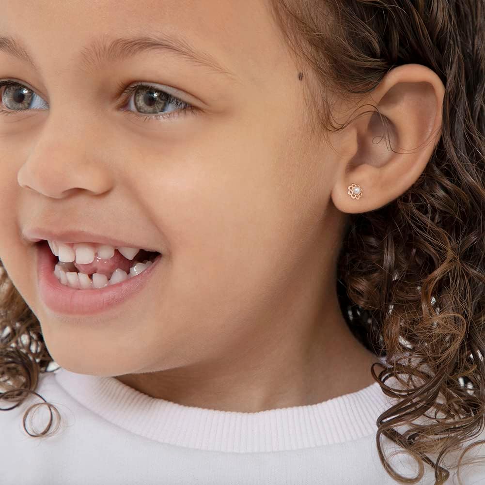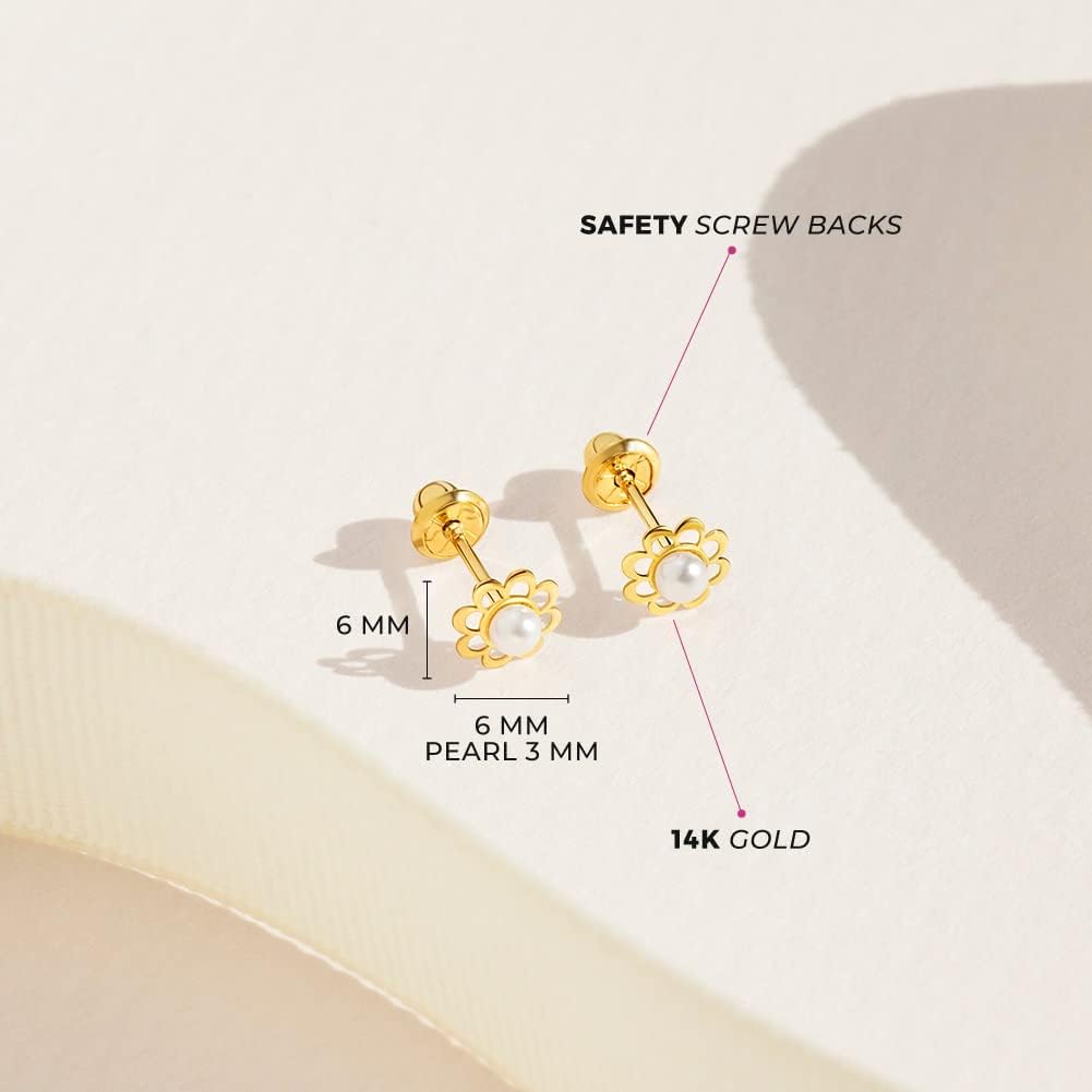 14k Yellow Gold Girl’s Dainty Cultured Pearl Flower Screw Back Stud Earrings – Small Flower Screw Back Earrings for Babies, Toddlers, Young Girls