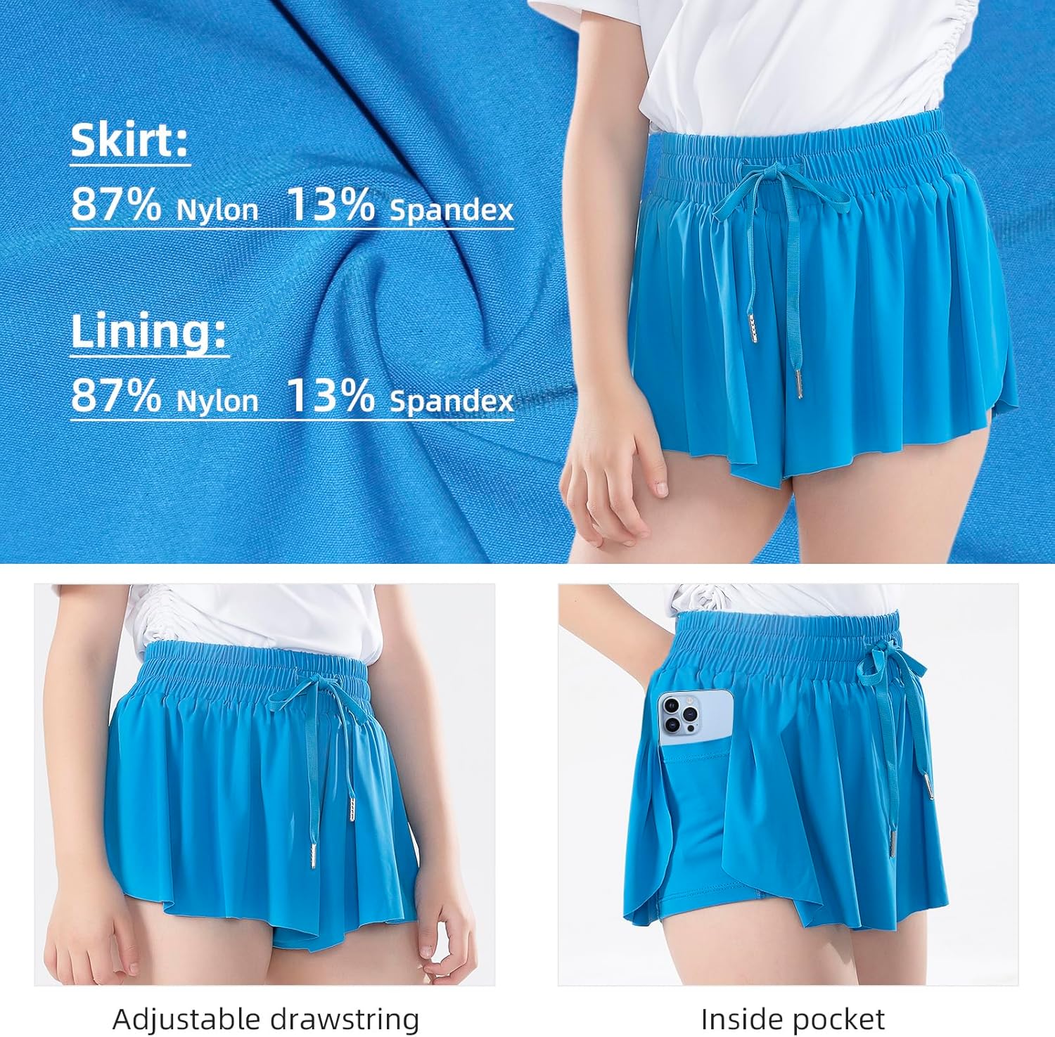 2 in 1 Girls Flowy Athletic Shorts for Running Youth/Toddler Butterfly Shorts with Pocket for Gym Athletic Workout