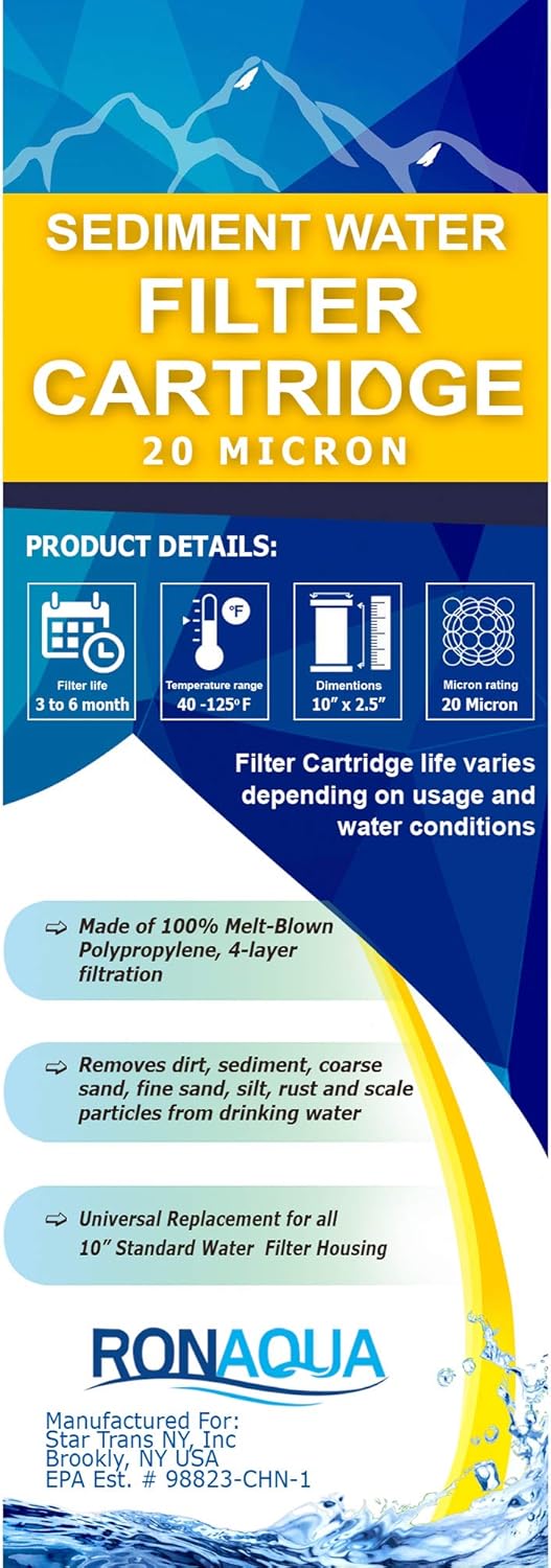 20 Micron Sediment Water Filter Cartridge 10″x 2.5″, Four Layers of Filtration, Removes Sand, Dirt, Silt, Rust, Made from Polypropylene for any RO Units or Whole House Water Filtration Systems 6 Pack