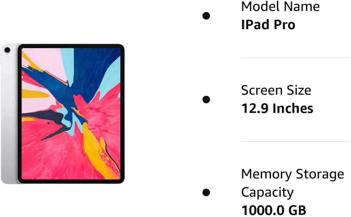 2018 Apple iPad Pro 3rd Gen (12.9 inch, Wi-Fi + Cellular, 1TB) Silver (Renewed)