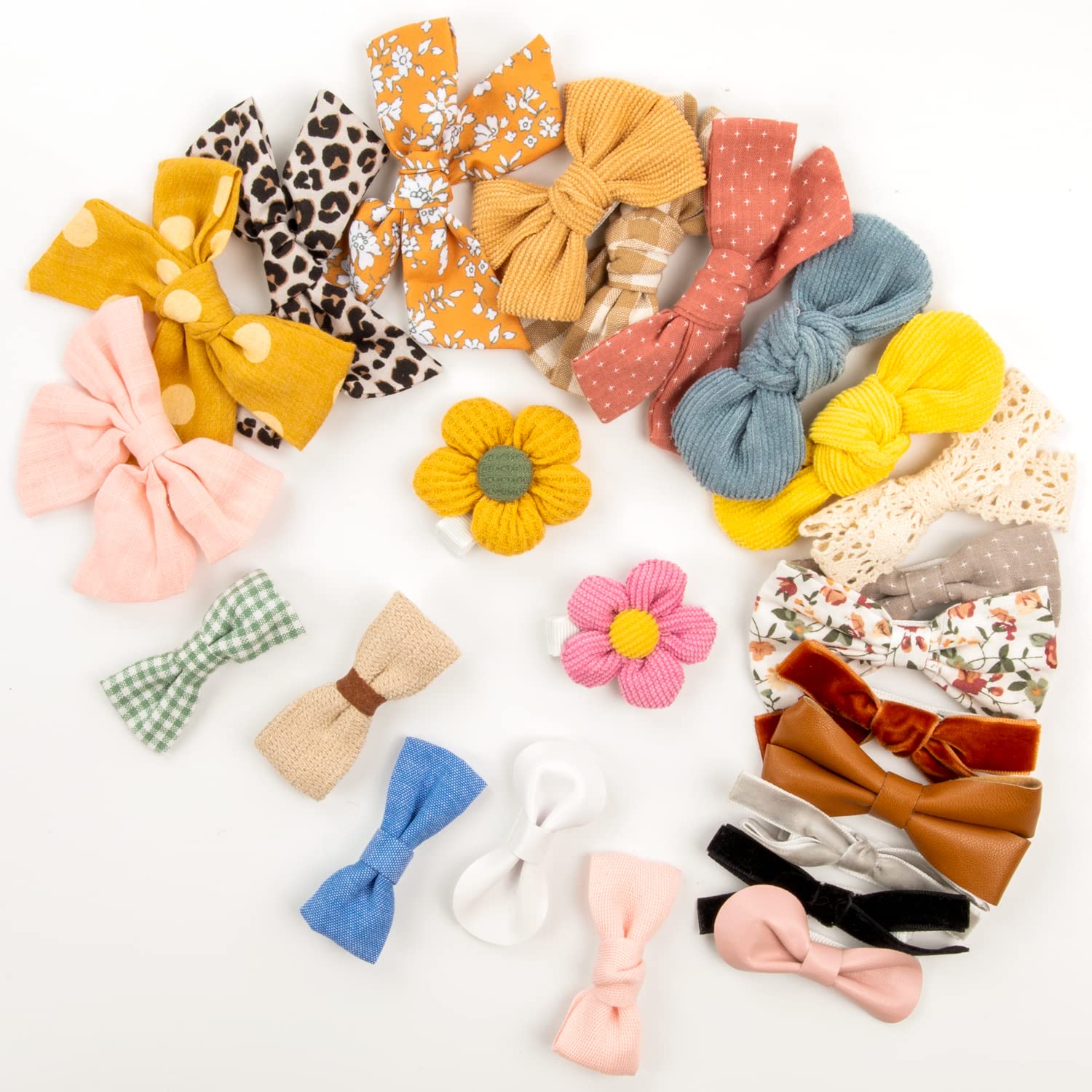 24 CUTE STYLES: 24 pieces selected baby hair clips of different colors, styles,sizes and textures.Right-sized toddler hair clips with cute styles like butterfly,flower,candy and fabrics like linen,ribbon ,lace,leather and velvet.Nice assortment to match every outfit.