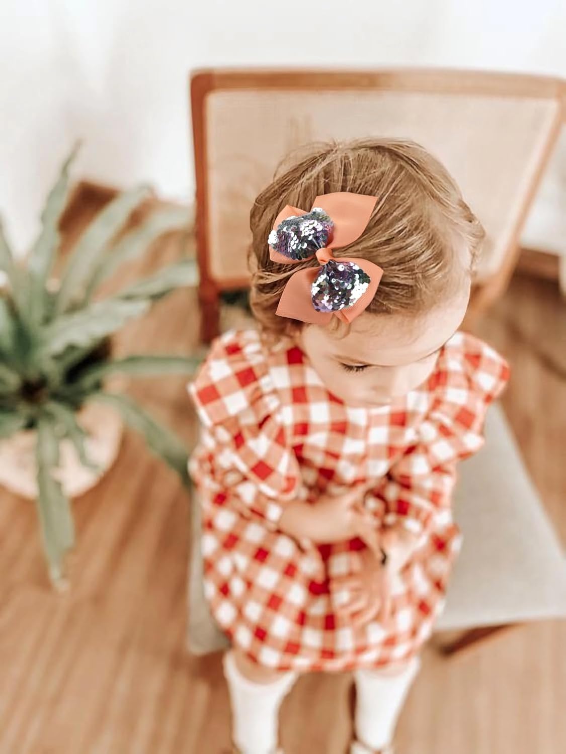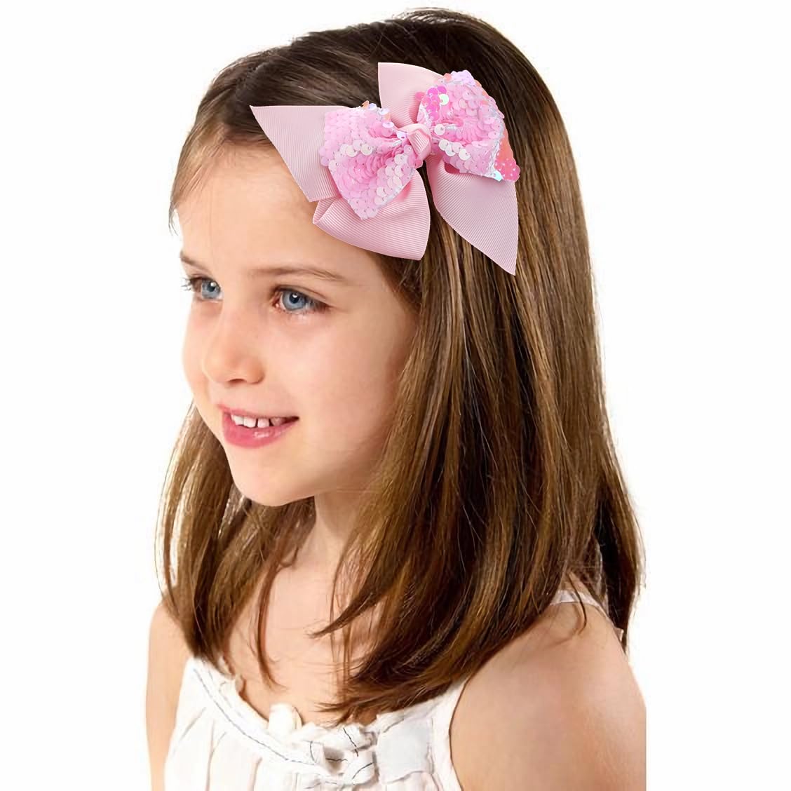 These 4.5 inch hair bows clips are made of reversible sequin ribbon mesh cloth material+grosgrain ribbon material. All are handmade with high quality, attached with metal alligator hair clips. They can hold on well, will not slip off, will not hurt your baby’s hair/head.