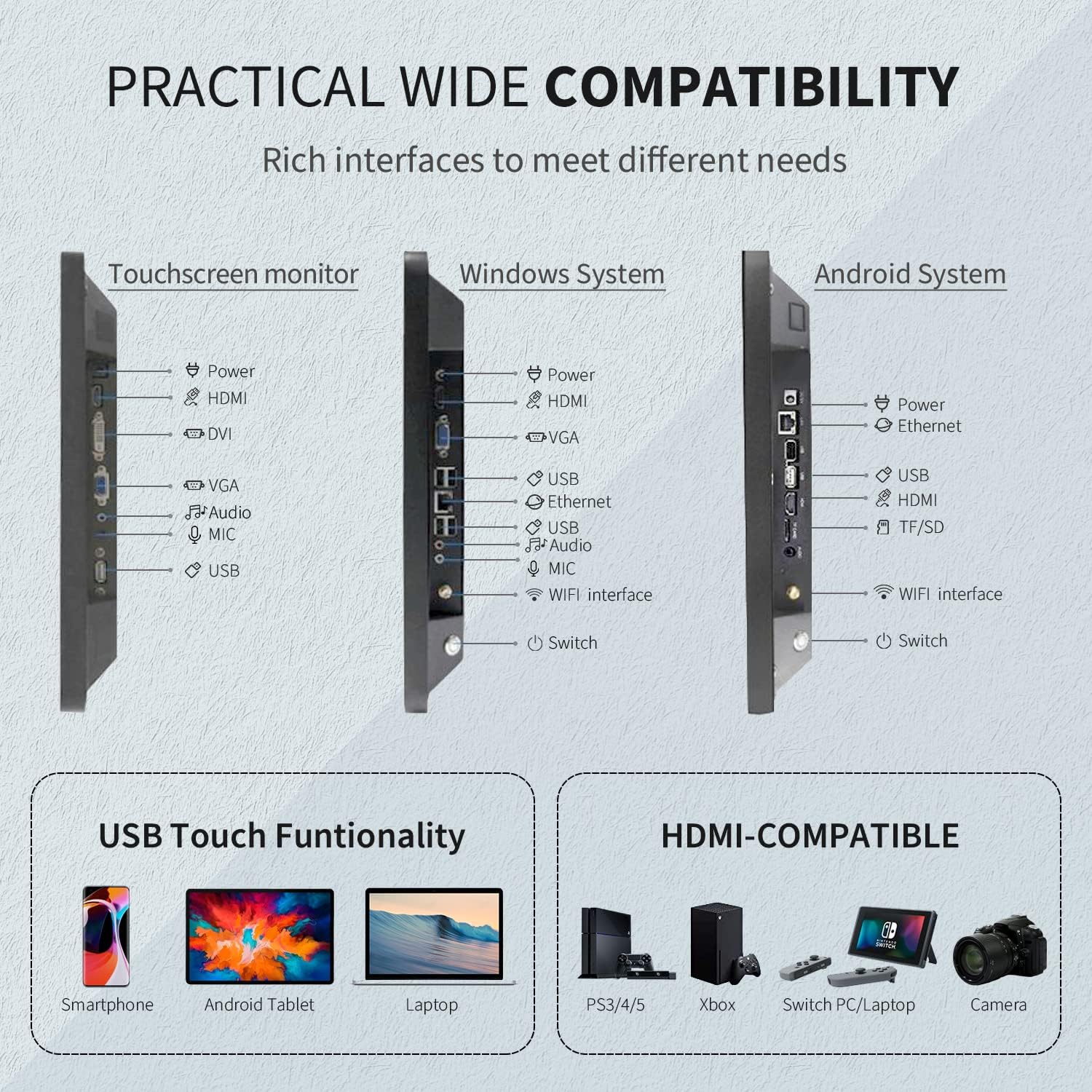 Plug and Play & Multi-Interface: this capacitive touchscreen all in one PC have 2x USB, HDMI-Port, TF/SD card slot, Lan & WiFi, built in speakers and headphone, great for listening to music, watching video and playing games, used for POS system, industrial monitor, CCTV monitor etc