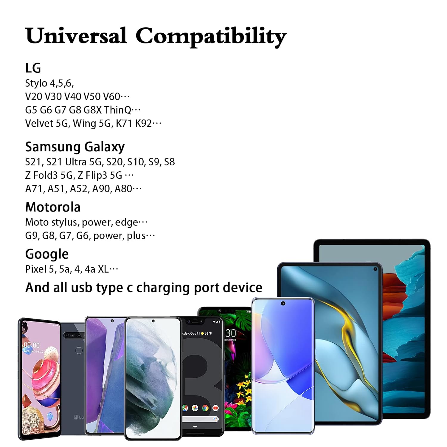 Universal Compatibility: usb c cable compatible for LG G5 G6 G7 G8 G8X V20 V30 V30S V35 V40 V50 ThinQ (Not for G4 G3 G2 V10 V60 ThinQ), LG Velvet 5G, LG Wing 5G, LG Stylo 4/5/6 (Not for Stylo 2/3), LG K51 K52 K61 K62 K71 K92 2020/2021 (Not for K20 K30 K40), Samsung Galaxy S21 S20 S10e S9 S8 Plus, Note 20 10 9 8, and more device.