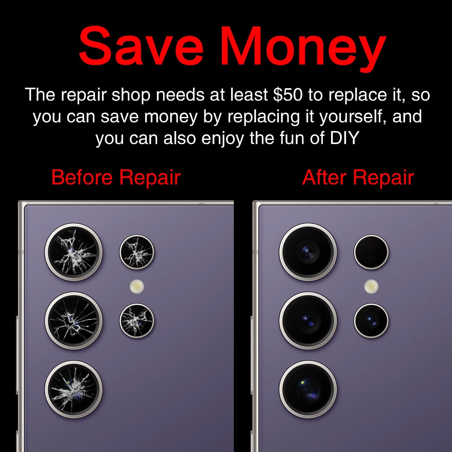 【Protect Phone By Replacing The Lens Glass】If the lens is broken you will not have access to the full capacity of your camera. The broken Samsung Galaxy S24 Ultra glasses will make all your pictures blurry and you won’t be able to use your camera. Having the Samsung Galaxy S24 Ultra lenses broken is that they can stop your camera stability and also in the long run you will have dust and particle of glasses on the sensor of those cameras. The broken lenses may also scratch you!
