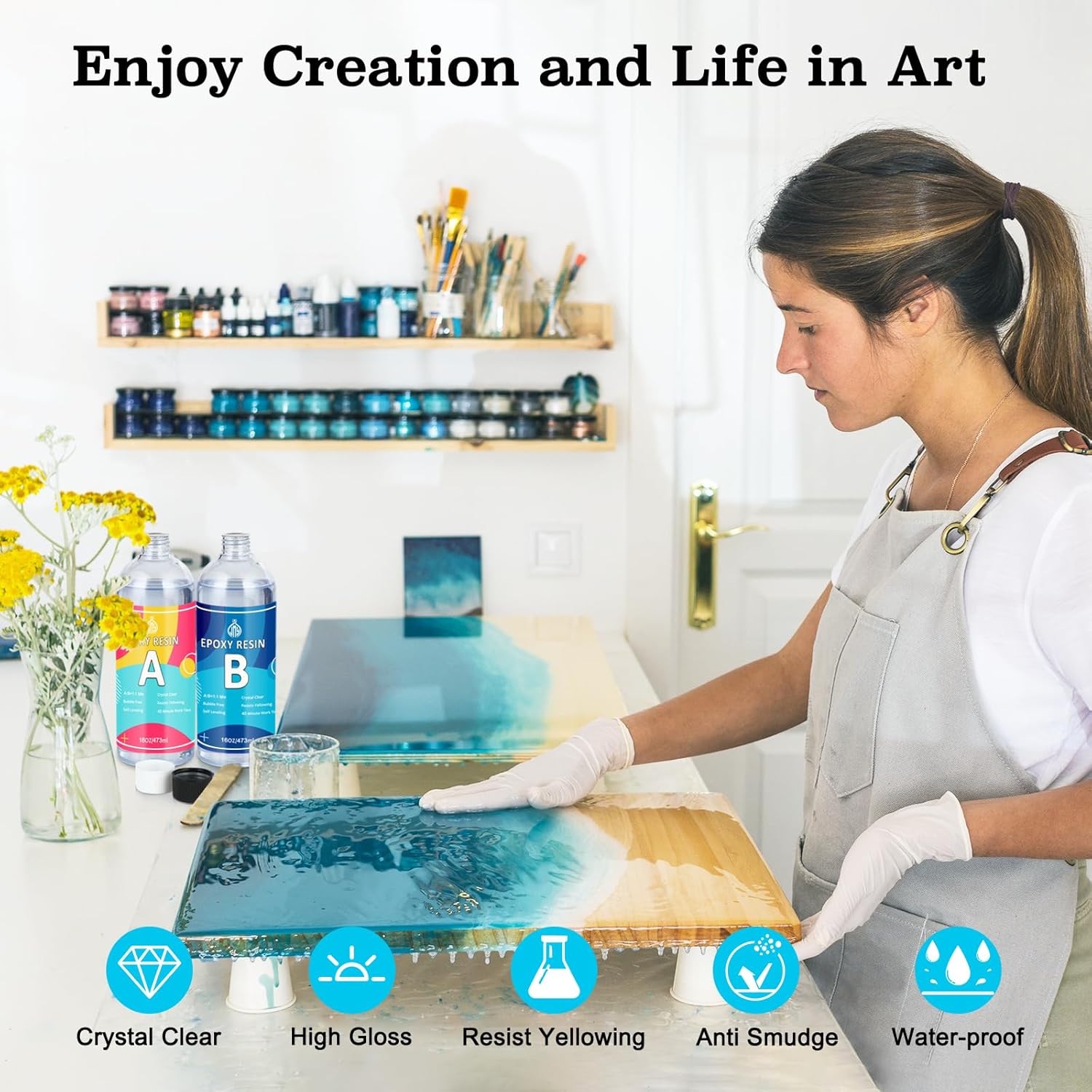 32OZ Epoxy Resin Kit, Crystal Clear Epoxy Resin No Bubble No Yellowing Art Resin Epoxy Casting and Coating for River Table Tops, Art Casting Resin,Jewelry Projects, Crafts, Molds