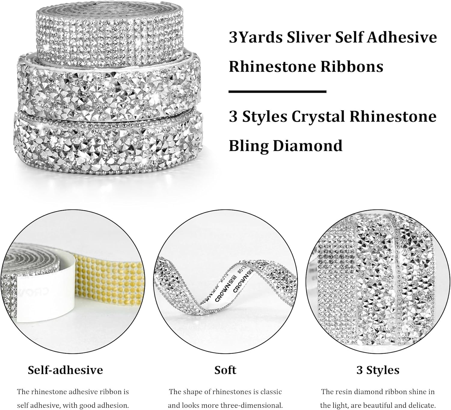 3Yards Sliver Self Adhesive Rhinestone Ribbons 3 Styles Crystal Rhinestone Bling Diamond DIY Sticker Strips Resin Rhinestone Ribbons for Arts Crafts, Wedding Cars Crafts, Dress Decoration