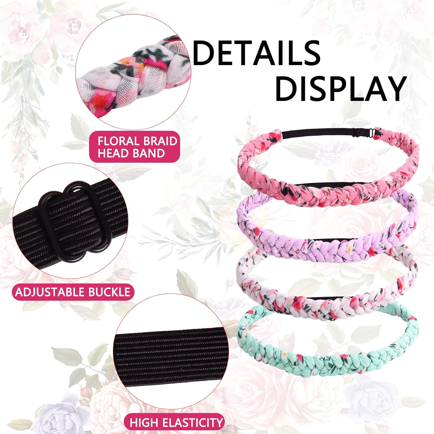 4 Pcs Adjustable Braided Headbands for Girls Adjustable Non Slip Thin Elastic Flower Hair Bands Stretch Sport Headband for Kids Hair Accessories