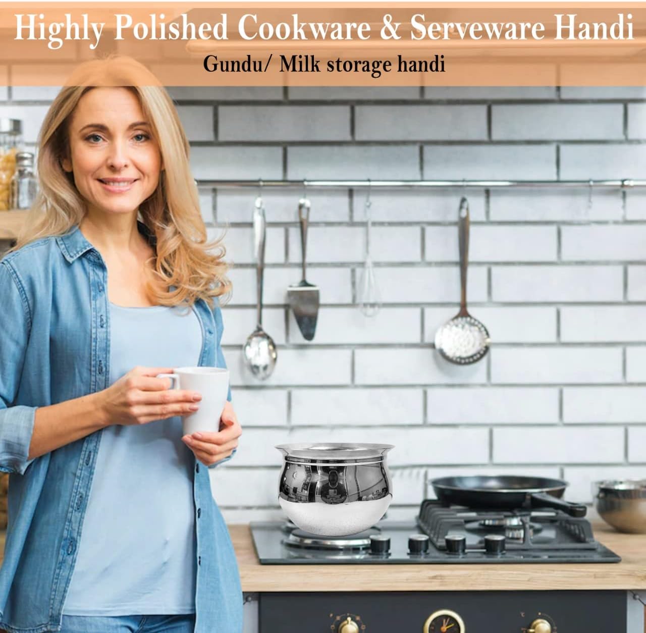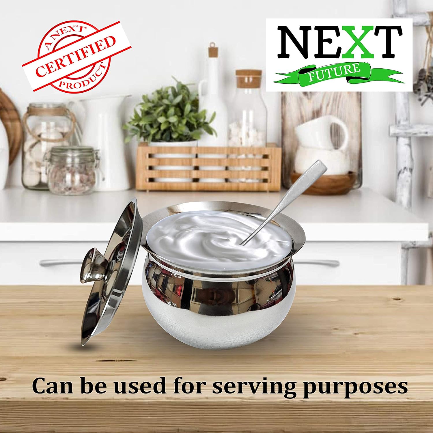 Next Future 20g Dahi/ Gundu Stainless steel Handi / Bartan is highly polished and very finely made stainless steel product. This is a very reliable cookware as well as serveware that brings royalness on the table. It contains 1 highly polished Dahi Stainless steel Handi, 1 Hi-Polished Lid and 1 100% pure Stainless steel Knob of 400ml with a size of 12.16cm x 7.60cm. Made with 100% food grade stainless steel and raw material being used of 20 Gauge these handis are very thick, strong and durable. This Stainless steel handi is apt for on the stove work as well as to be kept inside the refrigerator as a storage handi. This handi takes less place in your drawer as it is very compact. These pots are Ideal For Daily Use On Your Gas Stove. The Dahi handis are Energy Efficient as it Heats Evenly And Cooks Faster. Food Will Not Stick To Your Pan. The unique design of these handis ensures even distribution of heat, thus avoiding burning of food and providing a more fuel-efficient solution for your cooking needs. Along with being perfect utensils for cooking food, it can also be used to serve your meals in a stylish manner. This Handi set is ideal for Cooking Serving Pot Biryani Handi a wide range of Indian, Traditional and Western dishes. These are easy to clean, tough and long lasting. And to add on top of everything, This is the best gift set you can give to your friends and family with a beautiful gift message.