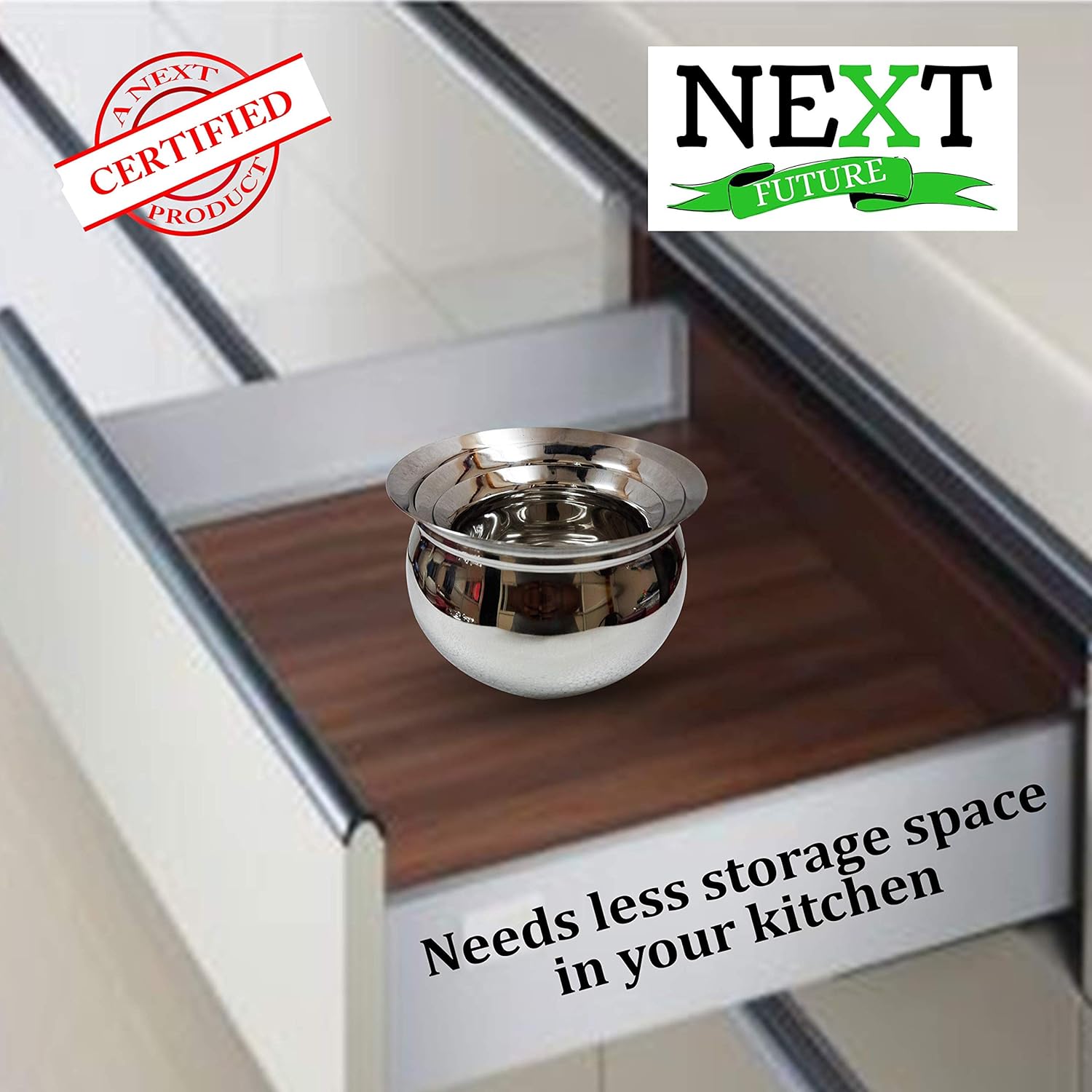 Next Future 20g Dahi/ Gundu Stainless steel Handi / Bartan is highly polished and very finely made stainless steel product. This is a very reliable cookware as well as serveware that brings royalness on the table. It contains 1 highly polished Dahi Stainless steel Handi, 1 Hi-Polished Lid and 1 100% pure Stainless steel Knob of 400ml with a size of 12.16cm x 7.60cm. Made with 100% food grade stainless steel and raw material being used of 20 Gauge these handis are very thick, strong and durable. This Stainless steel handi is apt for on the stove work as well as to be kept inside the refrigerator as a storage handi. This handi takes less place in your drawer as it is very compact. These pots are Ideal For Daily Use On Your Gas Stove. The Dahi handis are Energy Efficient as it Heats Evenly And Cooks Faster. Food Will Not Stick To Your Pan. The unique design of these handis ensures even distribution of heat, thus avoiding burning of food and providing a more fuel-efficient solution for your cooking needs. Along with being perfect utensils for cooking food, it can also be used to serve your meals in a stylish manner. This Handi set is ideal for Cooking Serving Pot Biryani Handi a wide range of Indian, Traditional and Western dishes. These are easy to clean, tough and long lasting. And to add on top of everything, This is the best gift set you can give to your friends and family with a beautiful gift message.