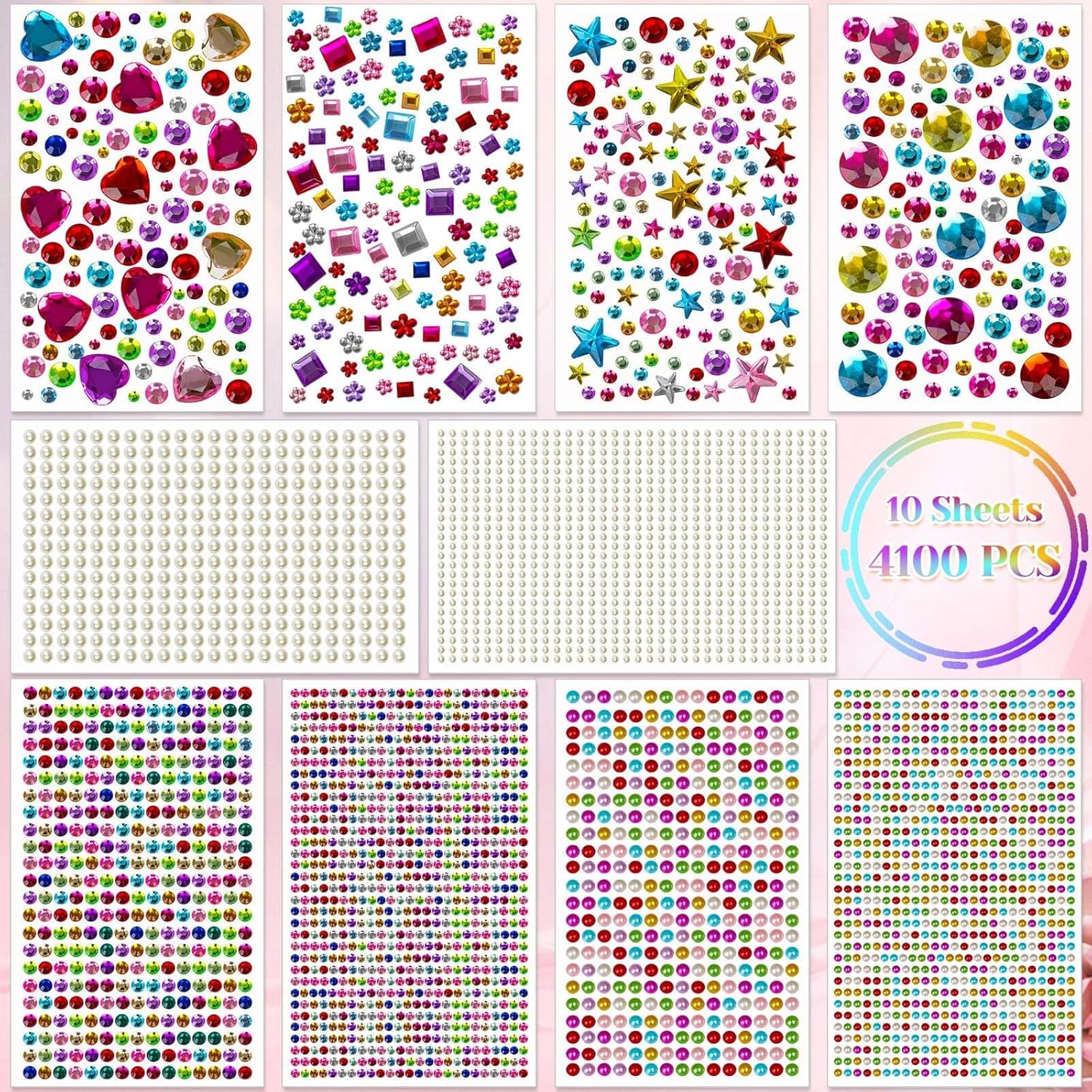 4100Pcs Gem Stickers for Crafts, 10 Sheets Self Adhesive Gemstones Pearl Jewels Stickers for Kids Crafts, Stick on Gems Pearls for Hair, Bling Rhinestone Stickers for Decoration
