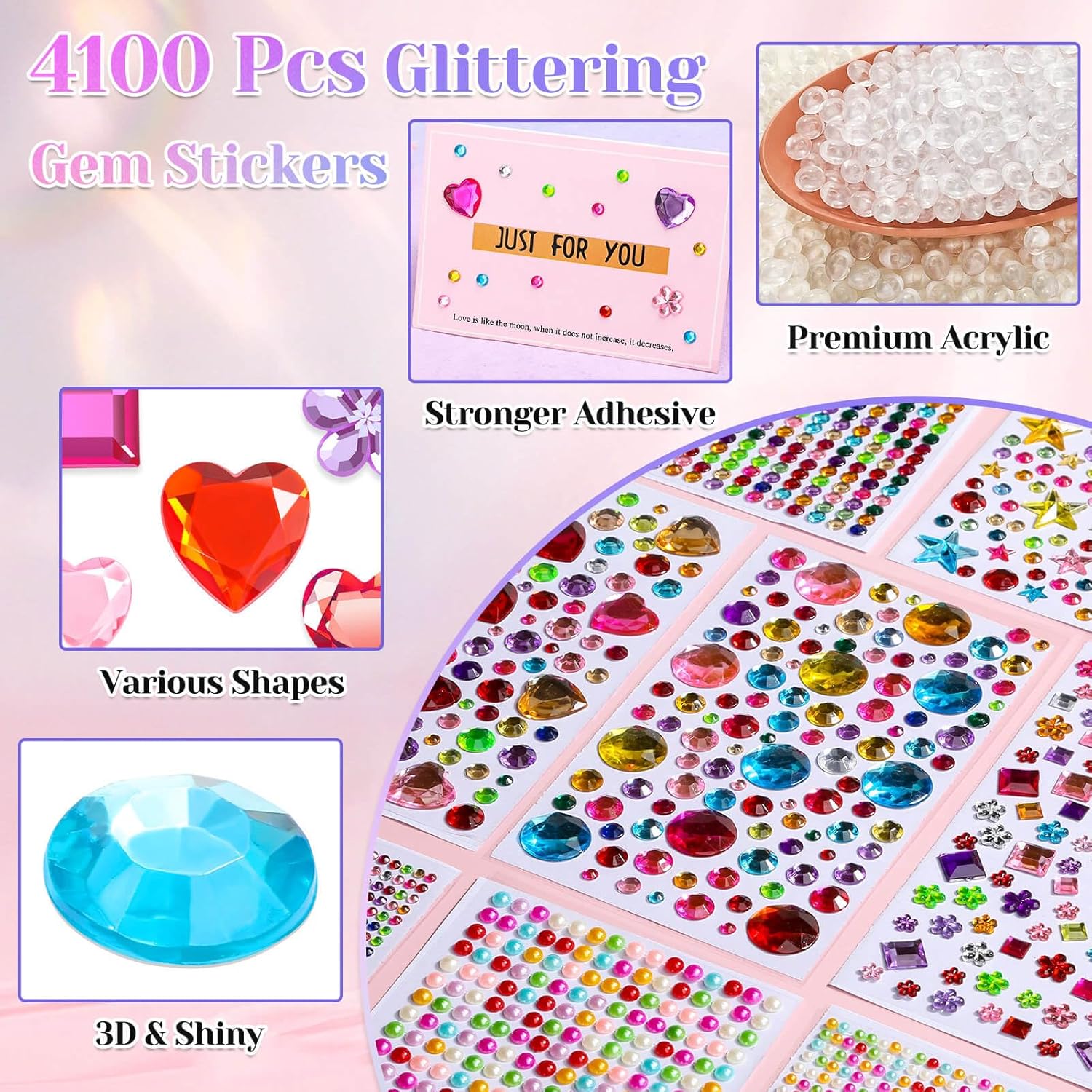 4100Pcs Gem Stickers for Crafts, 10 Sheets Self Adhesive Gemstones Pearl Jewels Stickers for Kids Crafts, Stick on Gems Pearls for Hair, Bling Rhinestone Stickers for Decoration