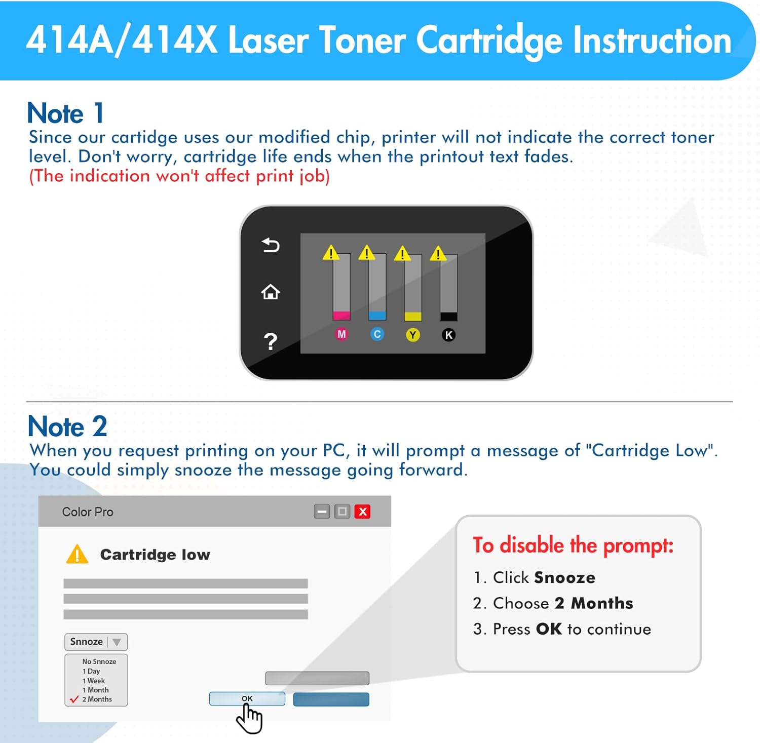 These 414X toner cartridges high yield are alread installed with chips, No need to transfer original 414A or 414X toner chip to them. High-quality production technology and raw materials provide high-quality printout
