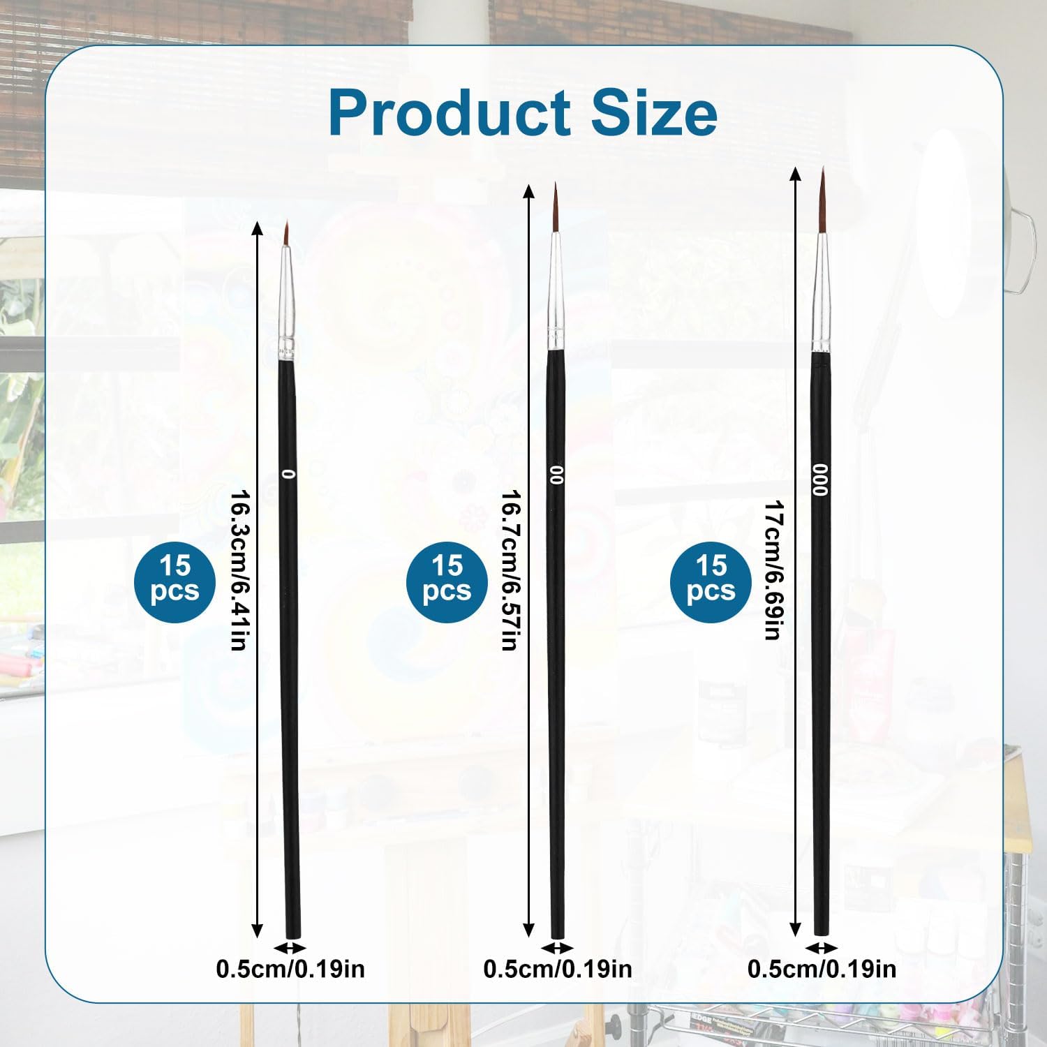 Product Sizes: The #0 miniature paint brushes measures about 16.3×0.5×0.5cm/6.42×0.19×0.19in, the #00 is about 16.7×0.5×0.5cm/6.57×0.19×0.19in and the #000 is about 17×0.5×0.5cm/6.69×0.19×0.19in. You can choose the models freely according to your specific needs.