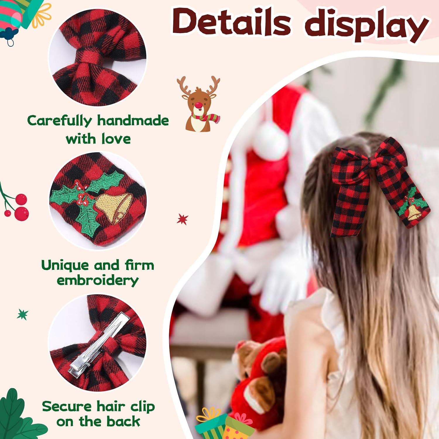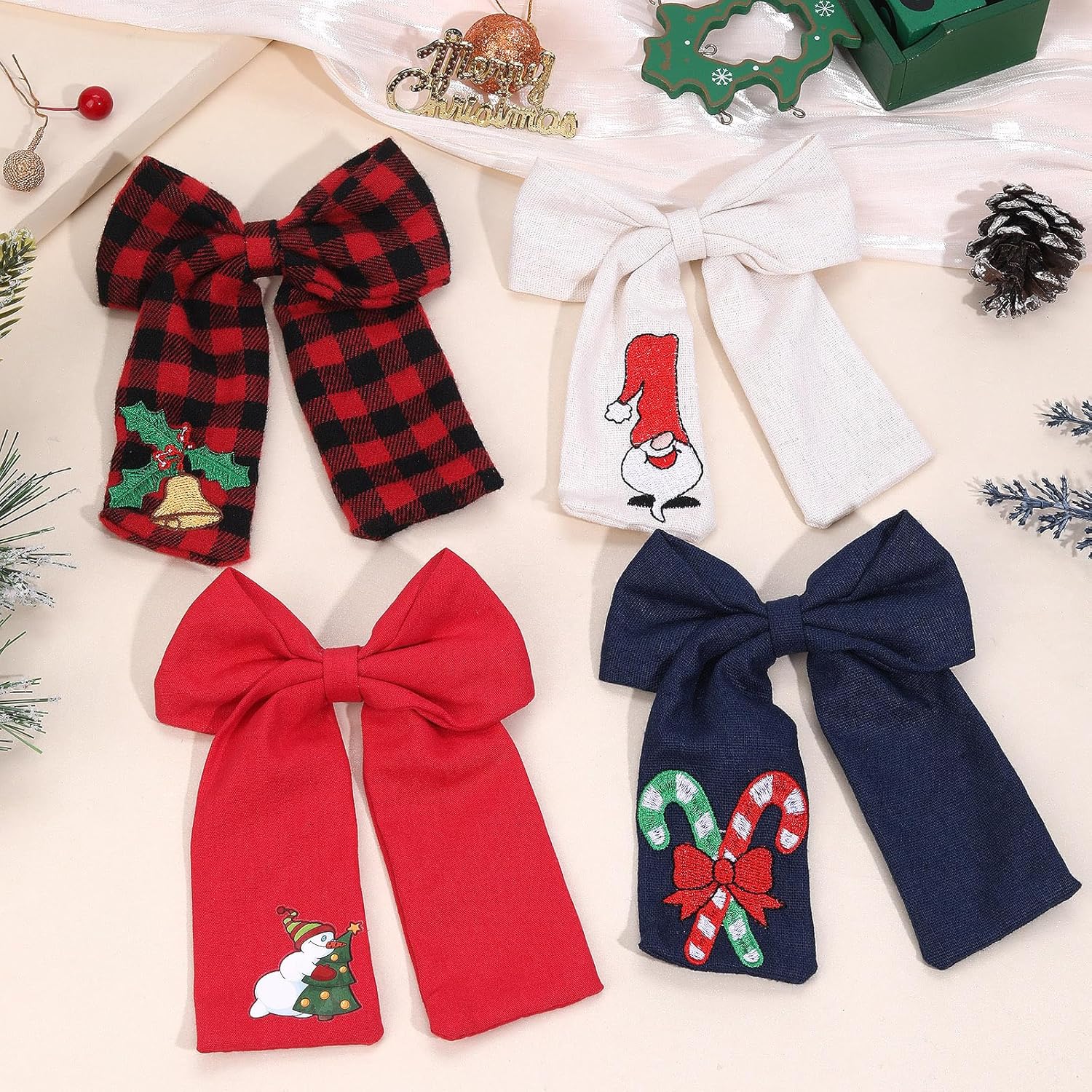 4PCS Christmas Hair Bow for Girls, Bow Clips with Embroidery Pattern Handmade Bowknot Hair Accessory for Toddler Baby Girls Women for Christmas Party