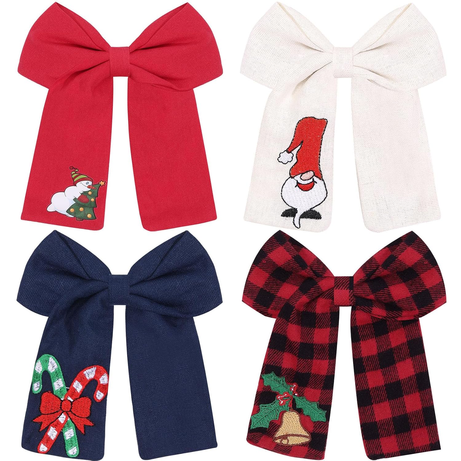 4PCS Christmas Hair Bow for Girls, Bow Clips with Embroidery Pattern Handmade Bowknot Hair Accessory for Toddler Baby Girls Women for Christmas Party