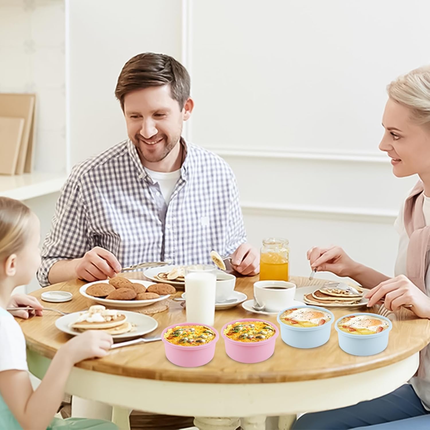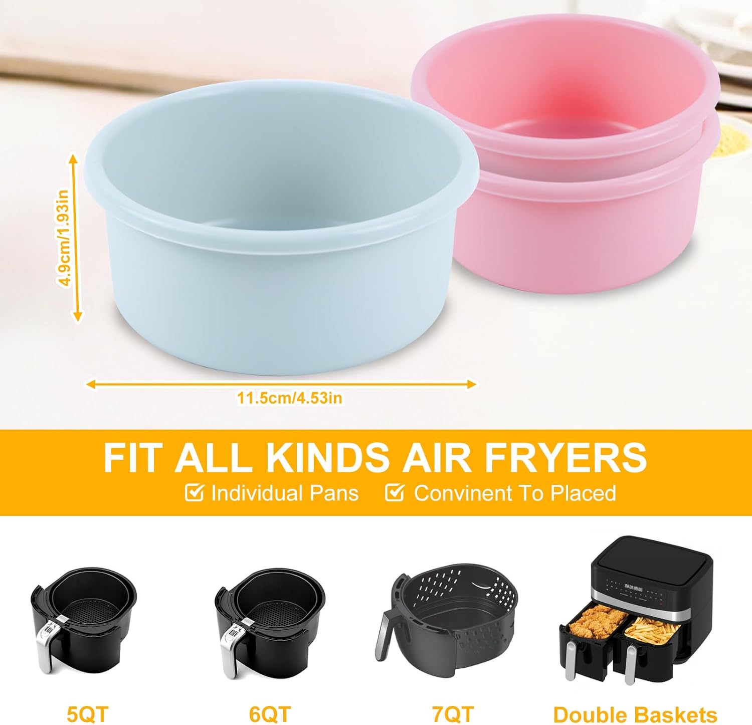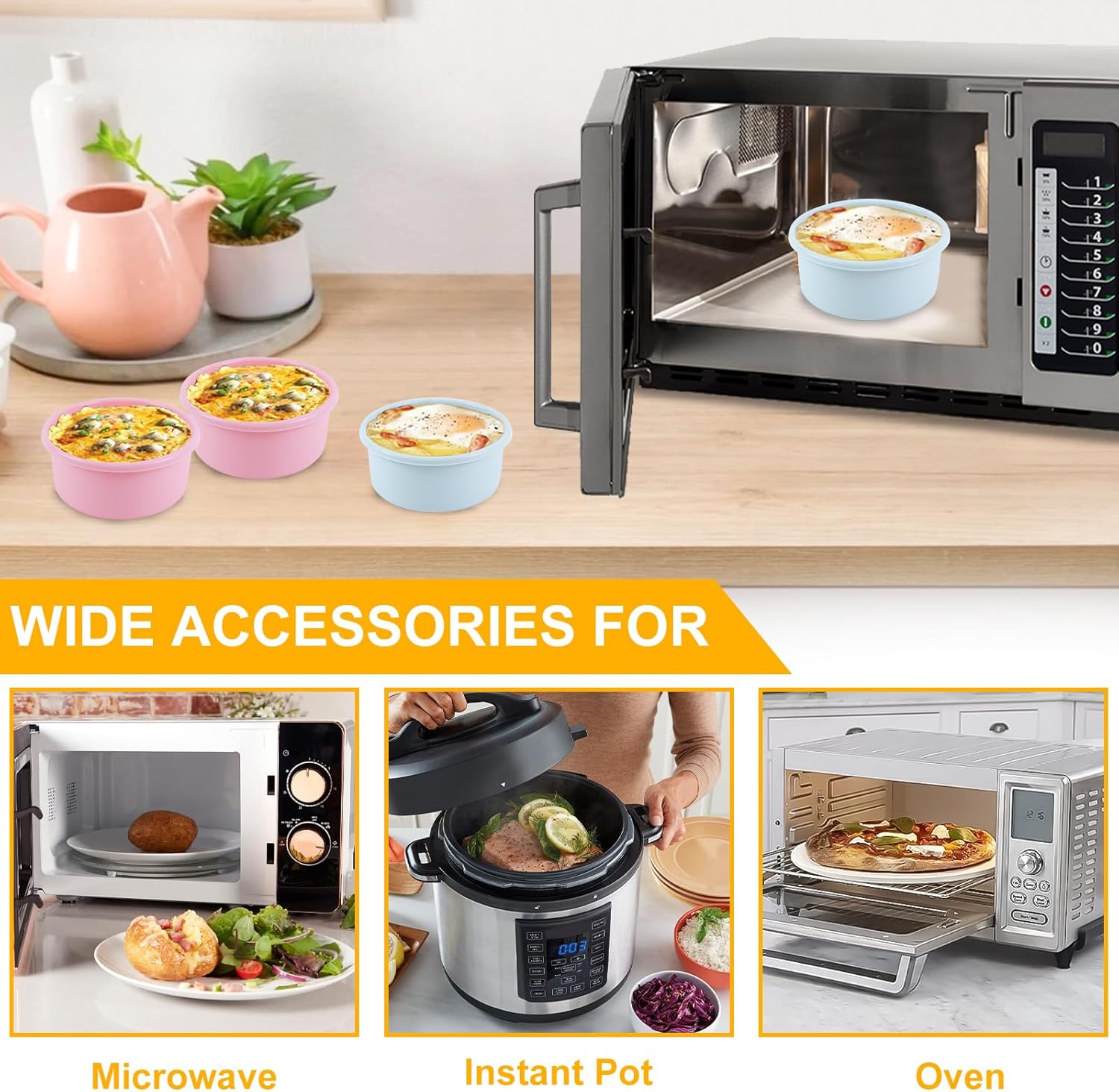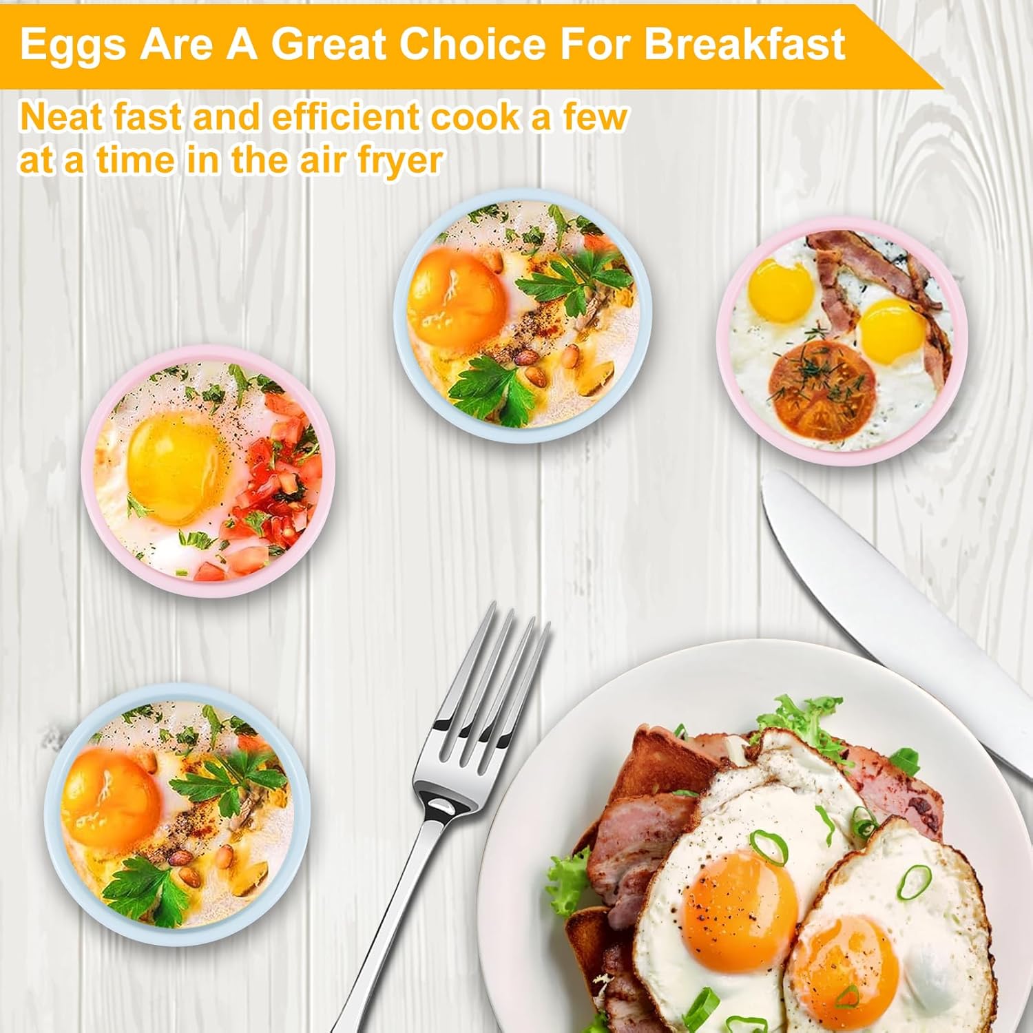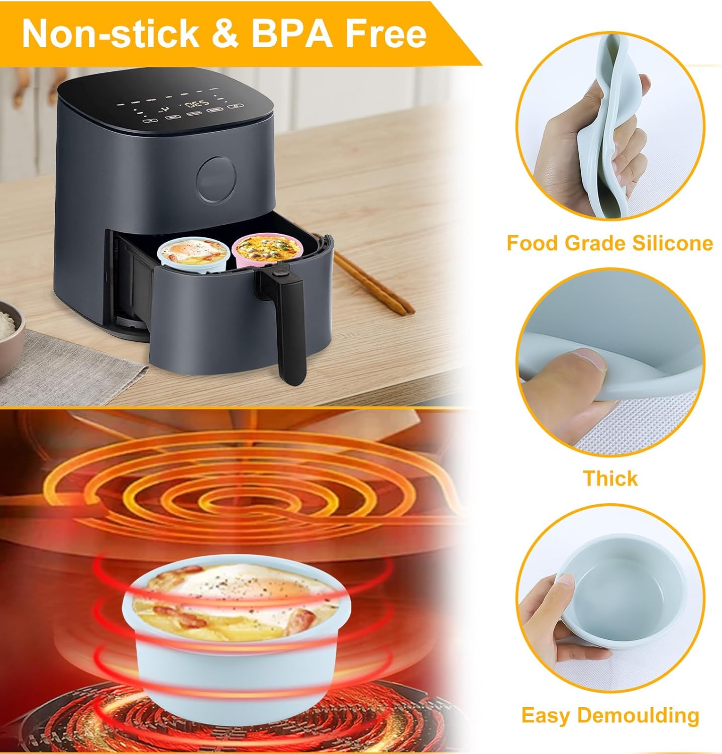 🥞【Egg Mold Set】: Package include 4 silicone egg bite molds, each bowl measures 4.53×1.93 inch. Ssilicone egg cups compatible with all styles of basket air fryers, pressure cookers, microwaves, ovens, slow cookers, and refrigerators.