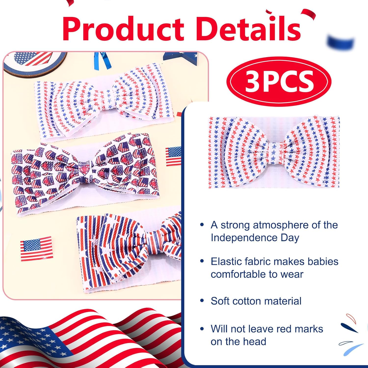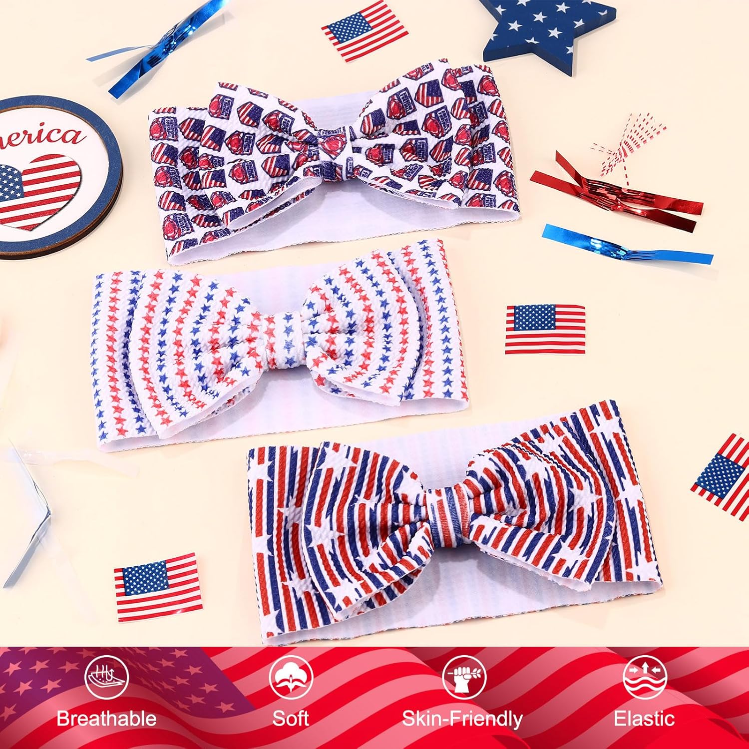 4th of July Baby Girl Bows, 3PCS Red White and Blue Newborn Headbands, Patriotic Baby Bows Elastic Nylon Baby Turban Headwraps America Flag Infant Hair Bows Accessories for Preemie Toddler