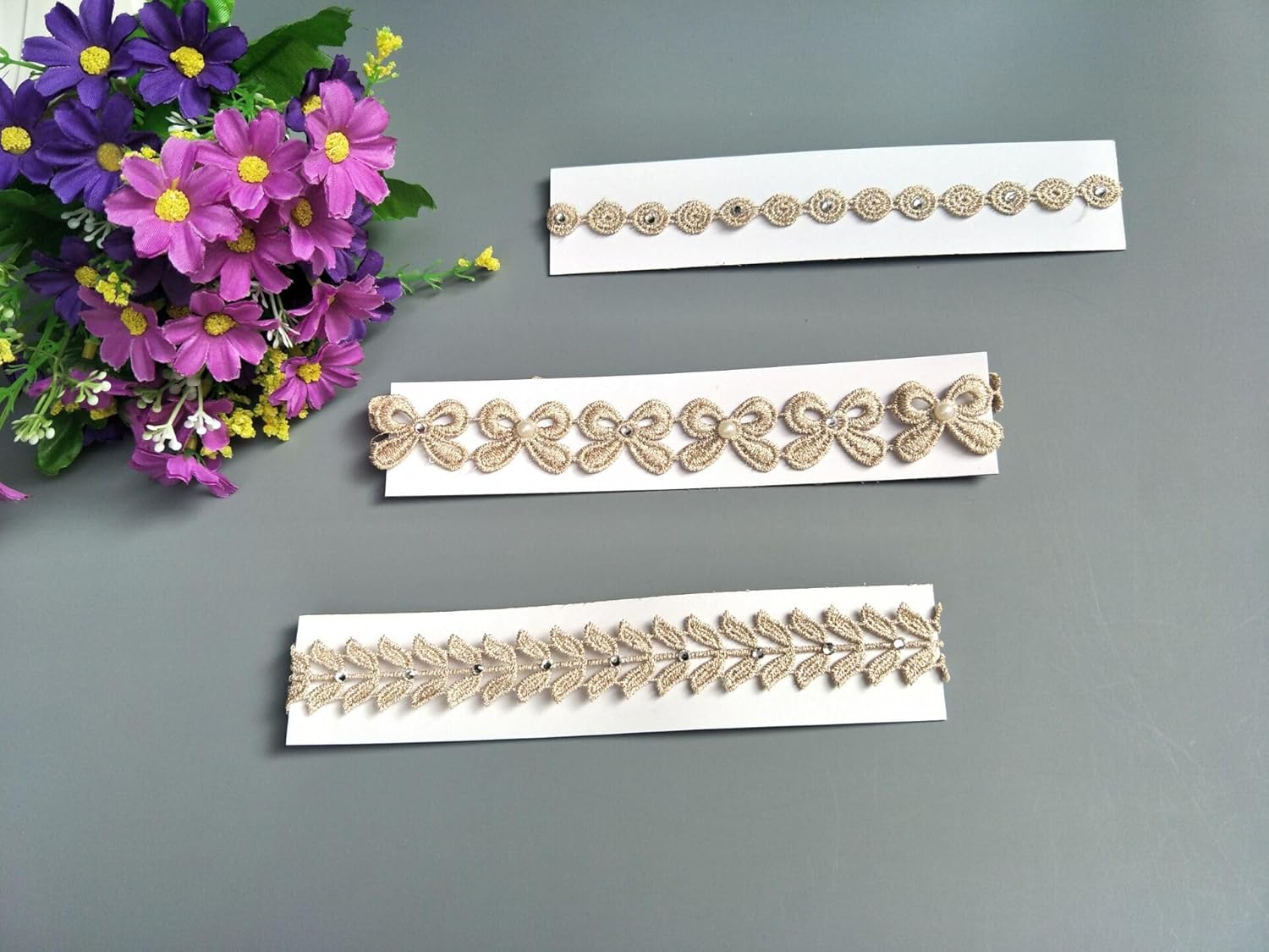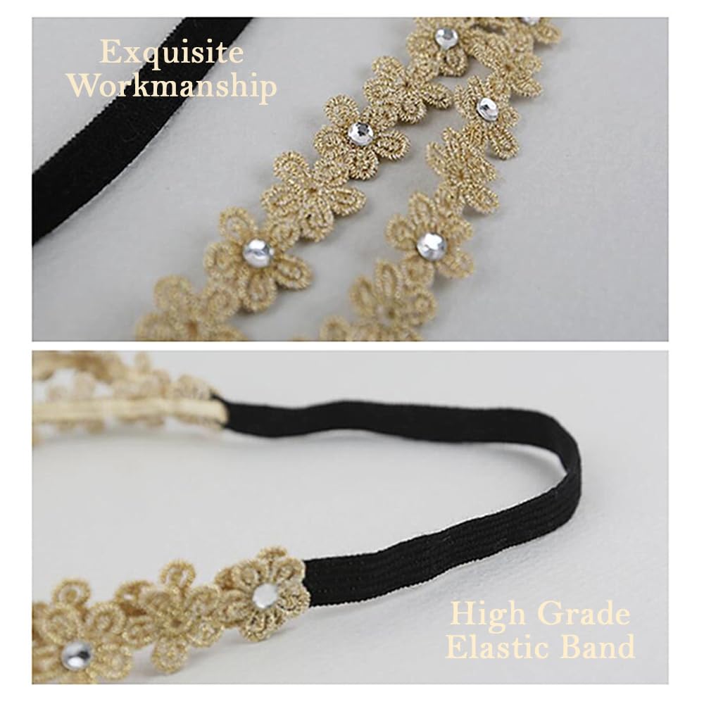 5 Pcs Gold Delicate Lace Floral Headbands for Baby Girl Infant Toddler Kid Stretchy Flower Bows Pearl Diamond Hair bands Princess Headwear Super Soft Elastic Nylon Hair Accessories Set