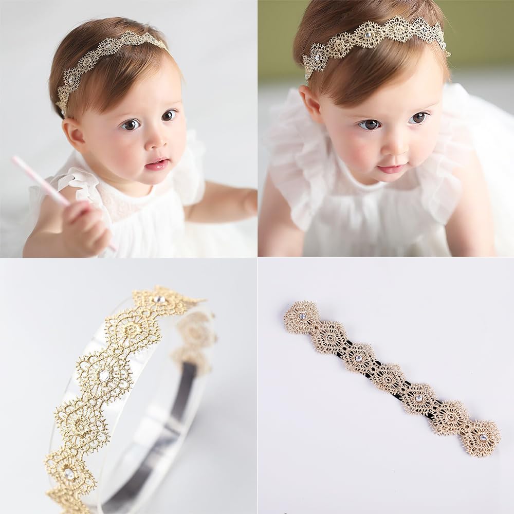 Our baby girls’ exquisite gold headbands set of 5 beautiful styles with high quality elastic bands offer comfort, gentle and lovely princess look for your little girl.★Materials: soft & delicate lace, elastic bands★Design: 5 Elegant & Vintage Princess Styles bring much beauty and charming to your babies.★Color: Gold★Occasions: Soft & comfortable headband perfect for casual wear in all seasons, and great for special occasions like wedding party, holiday party, first communion, christening, baptism, baby shower, artistic photo shoot, bridesmaid dress, tea party, rustic theme wedding, first birthday, pageant, formal party, New Year, Christmas, blessing day, baby’s dedication ceremony, baby blessing ceremony, dinner party, family photo, holy communion, family gathering, Easter, all events and occasions.★Five Items in One Pack: 5 pcs in different designs.
