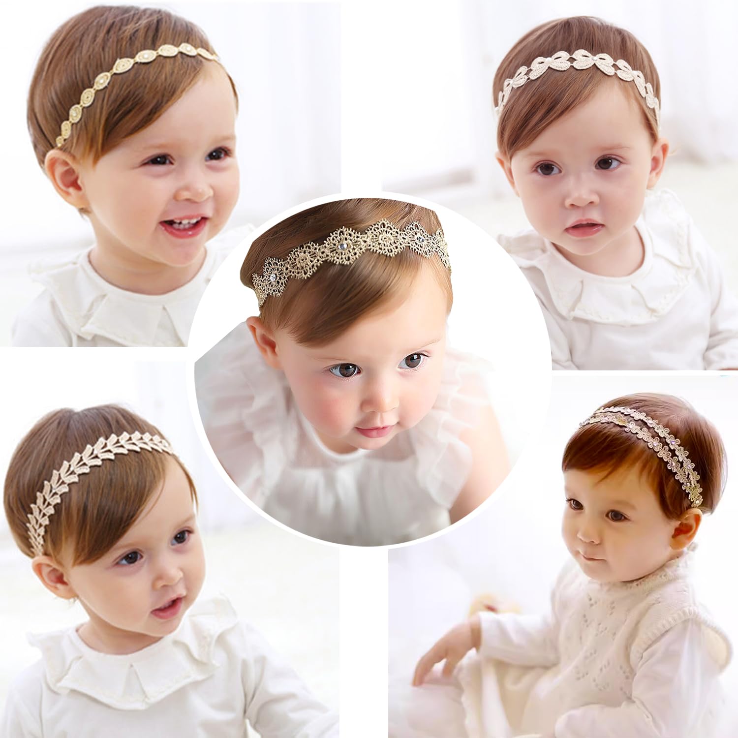 Our baby girls’ exquisite gold headbands set of 5 beautiful styles with high quality elastic bands offer comfort, gentle and lovely princess look for your little girl.★Materials: soft & delicate lace, elastic bands★Design: 5 Elegant & Vintage Princess Styles bring much beauty and charming to your babies.★Color: Gold★Occasions: Soft & comfortable headband perfect for casual wear in all seasons, and great for special occasions like wedding party, holiday party, first communion, christening, baptism, baby shower, artistic photo shoot, bridesmaid dress, tea party, rustic theme wedding, first birthday, pageant, formal party, New Year, Christmas, blessing day, baby’s dedication ceremony, baby blessing ceremony, dinner party, family photo, holy communion, family gathering, Easter, all events and occasions.★Five Items in One Pack: 5 pcs in different designs.