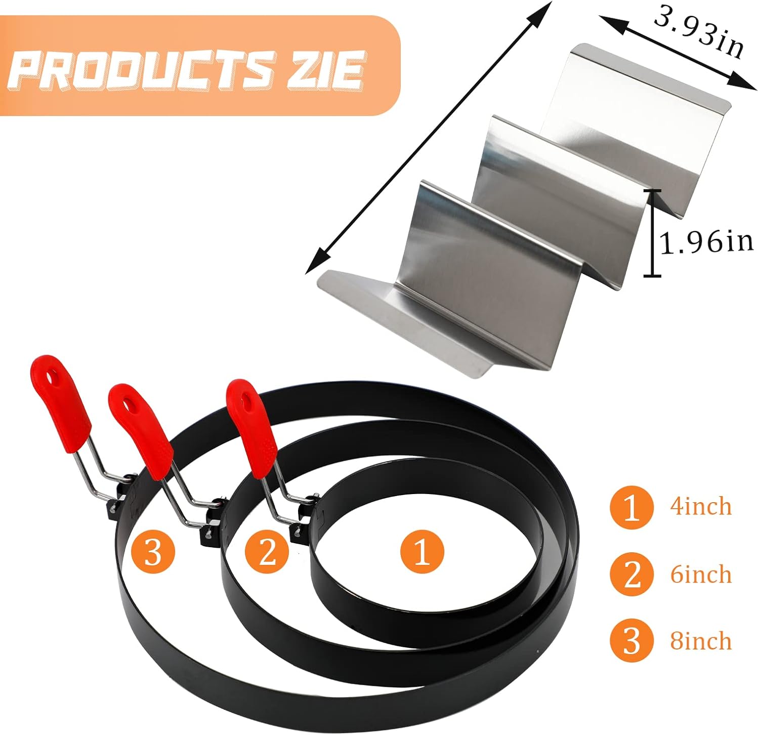 5 PCS Pancake Mold Sets, 3 Pcs Egg Circles for Frying Eggs, 2 PCS Taco Shell Holder Stand, Rack Holds Up to 3 Tacos, 4 Inch 6 Inch 8 Inch Griddle Egg Ring with Silicone Handle for Breakfast Sandwiches