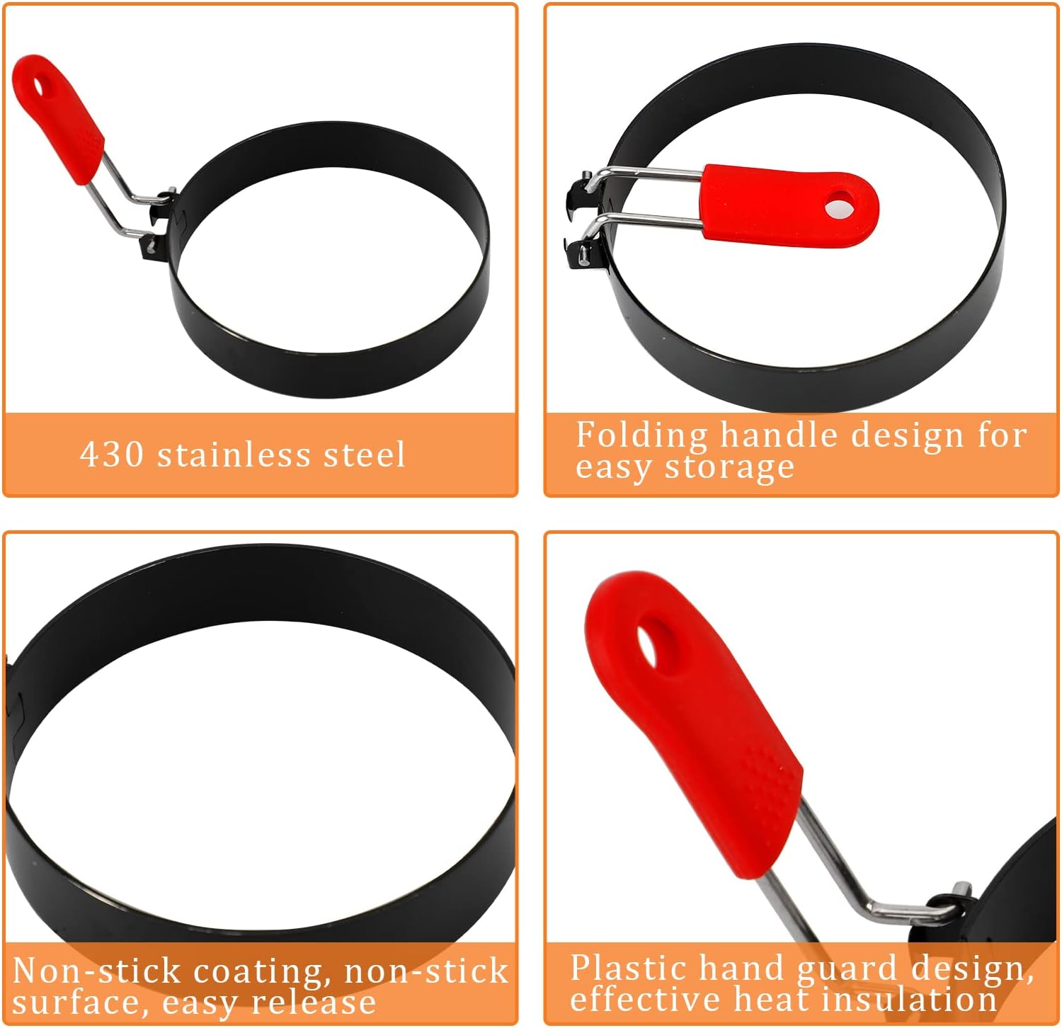 【Easy To Clean】- The egg cooker rings with red silicone handles are easy to clean and no maintenance required, non-stick coating and dishwasher safe