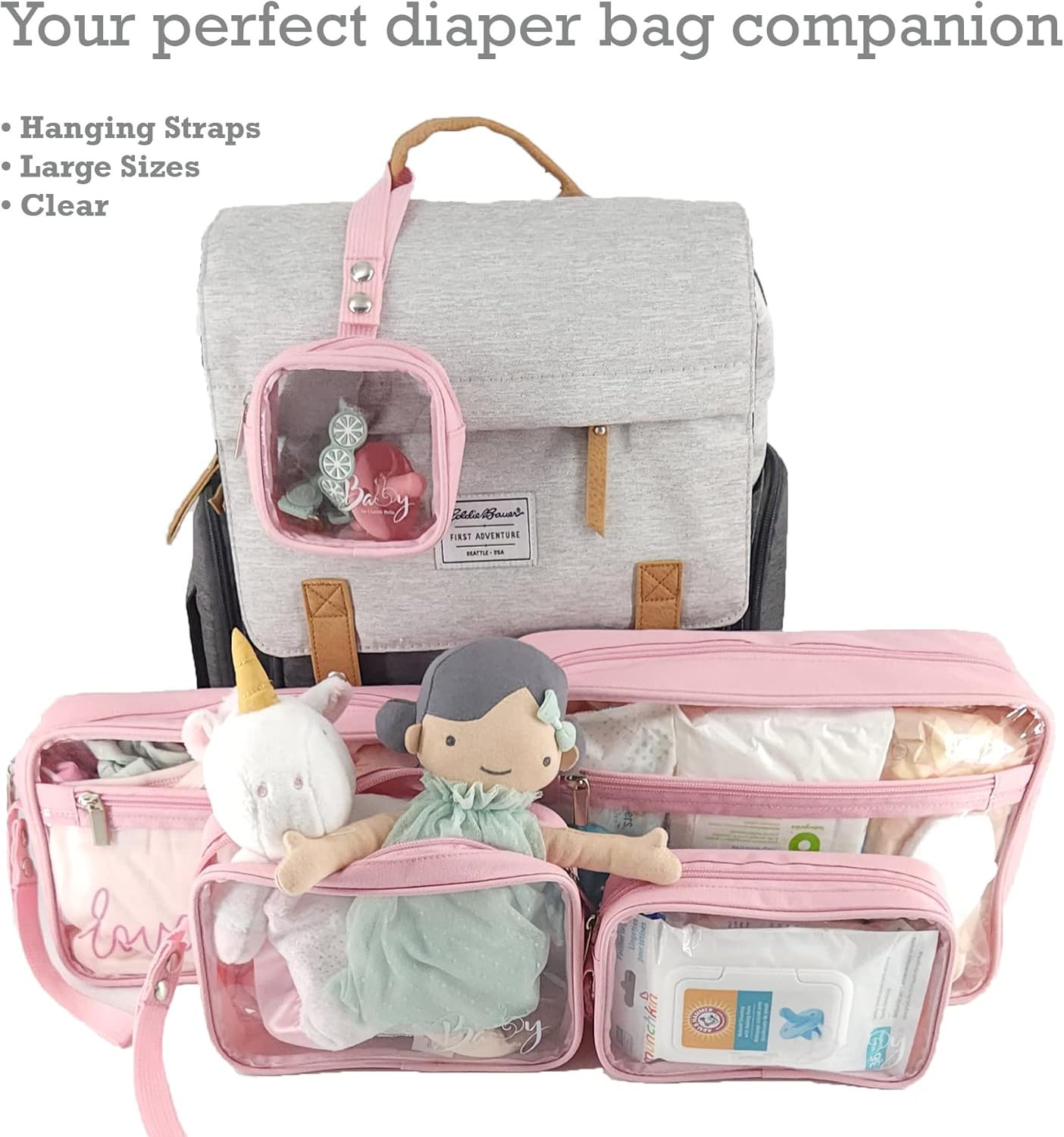 5 Piece Diaper Bag Organizer Pouch Set, Clear with Straps and Pacifier Case – Pink