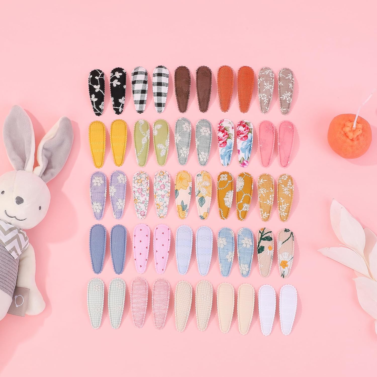 【PACKAGING】50Pcs Assorted flower fabric fully lined metal snap clip with a clear storage box. A perfect snap hair clip set for teens, and women.