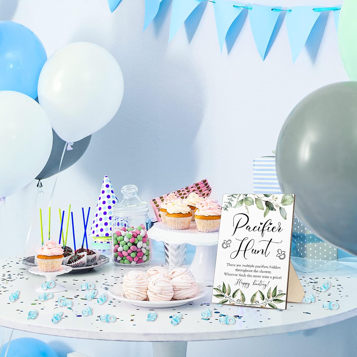 51 Pcs Cool Baby Shower Games Include Baby Pacifier Hunt Sign Wooden Baby Gift Sets Gender Reveal Party Favors 50 Acrylic Baby Pacifiers Mini Plastic Pacifiers (Greenery, Blue)